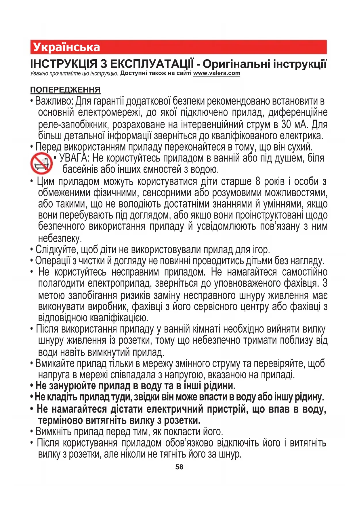 - УВАГА: Не користуйтесь приладом в ванній або під душем, біля басейнів або інших ємностей з водою.