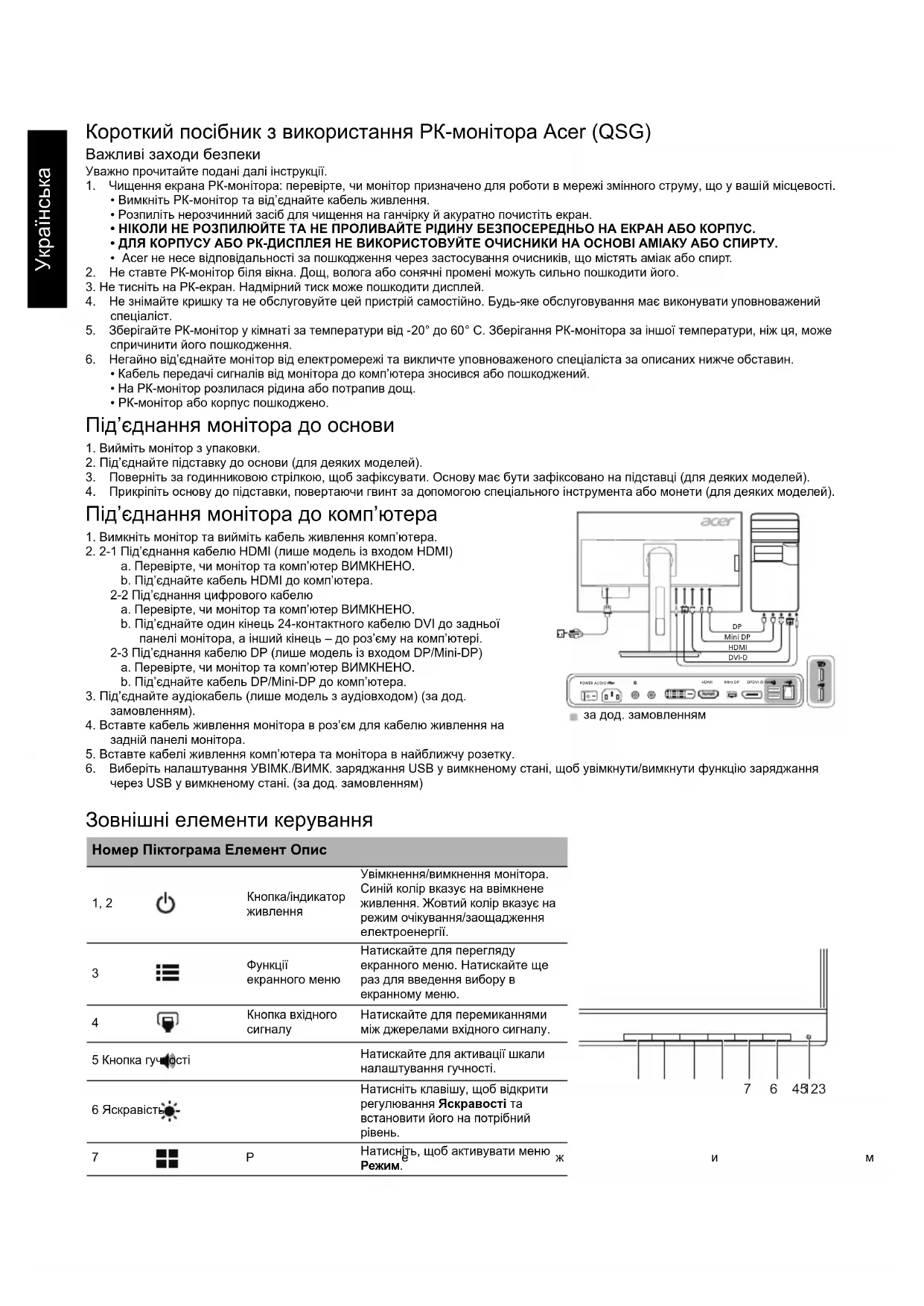 через USB у вимкненому стані. (за дод. замовленням) Зовнішні елементи керування Номер Піктограма Елемент Опис 1, 2 Кнопка/індикатор живленняУвімкнення/вимкнення монітора. Синій колір вказує на ввімкнене живлення. Жовтий колір вказує на режим очікування/заощадження електроенергії. Функції екранного менюНатискайте для перегляду екранного меню. Натискайте ще раз для введення вибору в екранному меню. Кнопка вхідного сигналуНатискайте для перемиканнями між джерелами вхідного сигналу.5 Кнопка гучностіНатискайте для активації шкали налаштування гучності.6 ЯскравістьНатисніть клавішу, щоб відкрити регулювання Яскравості та встановити його на потрібний рівень.7РежимНатисніть, щоб активувати меню Режим. HDMI DVI-DMini DP POWER AUDIO INHDMI DPDVI-D INMini DP за дод. замовленням 1234567Українська Правові норми та заходи безпеки Повідомлення Федеральної комісії зв’язку Цей пристрій пройшов перевірку та відповідає обмеженням для цифрових пристроїв класу В, як передбачено частиною 15 Правил Федеральної комісії зв’язку. Ці обмеження призначено для забезпечення належного захисту від шкідливих перешкод у житловому середовищі. Цей пристрій створює, використовує та може випромінювати радіочастотну енергію, а тому, у разі встановлення та використання із порушенням інструкцій, може призводити до виникнення шкідливих перешкод для радіозв’язку Проте немає жодної гарантії, що у певному варіанті встановлення перешкоди не виникатимуть. Якщо цей пристрій створює перешкоди для прийому радіосигналу або телевізійного сигналу, що можна перевірити шляхом вимикання та вмикання пристрою, рекомендується спробувати усунути перешкоди одним із наведених способів. Налаштуйте або змініть розташування прийомної антени. Збільшіть відстань між пристроєм і приймачем. Під’єднайте пристрій та приймач до різних розеток. Зверніться за допомогою до дилера або досвідченого телерадіотехніка. Заява про відповідність ЄС Цим повідомленням компанія Acer Inc. стверджує, що цей РК-монітор відповідає важливим вимогам та іншим відповідним умовам Директиви щодо електромагнітної сумісності 2014/30/EU, Директиви щодо низької напруги 2014/35/EU, Директиви про обмеження вмісту шкідливих речовин 2011/65/EU та Директиви 2009/125/EC щодо визначення норм для встановлення вимог стосовно екодизайну для виробу, пов’язаного з енергією.