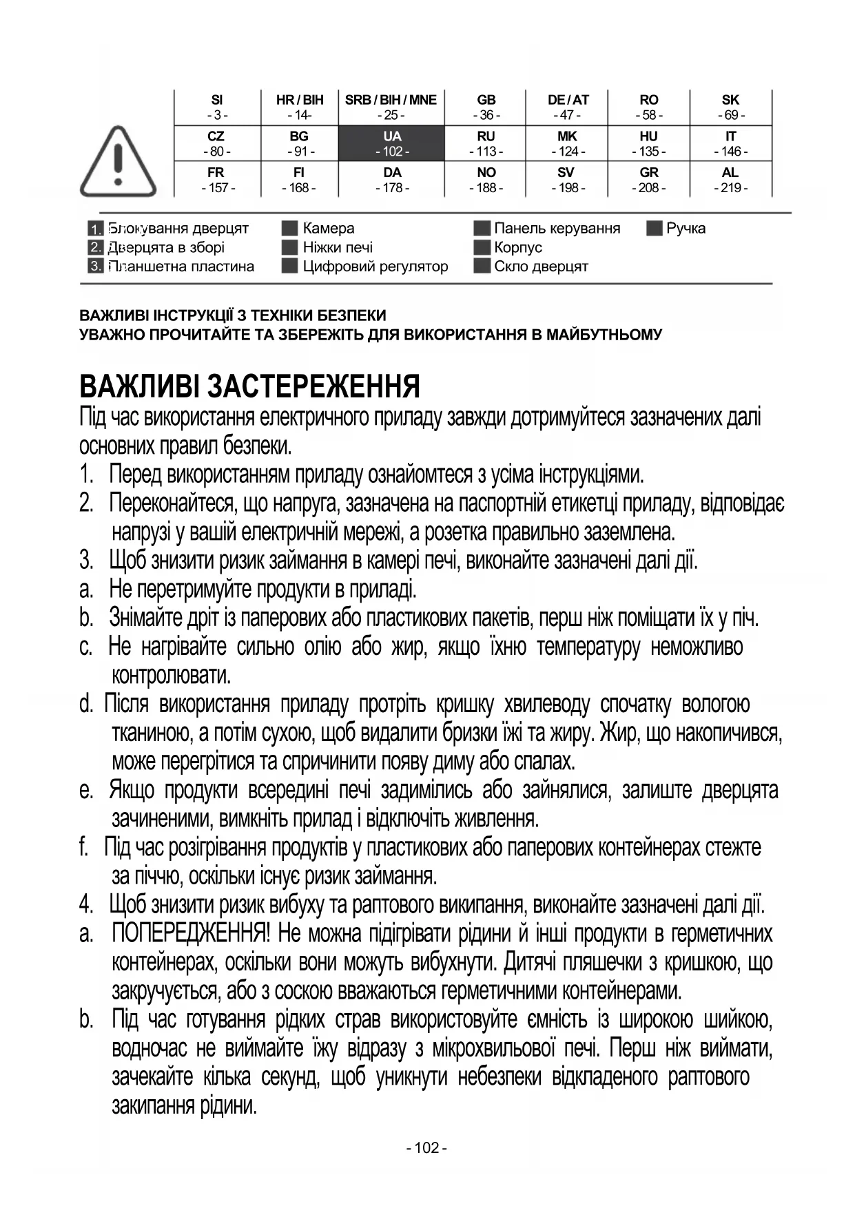a. ПОПЕРЕДЖЕННЯ! Не можна підігрівати рідини й інші продукти в герметичних контейнерах, оскільки вони можуть вибухнути. Дитячі пляшечки з кришкою, що закручується, або з соскою вважаються герметичними контейнерами. b. Під час готування рідких страв використовуйте ємність із широкою шийкою, водночас не виймайте їжу відразу з мікрохвильової печі. Перш ніж виймати, зачекайте кілька секунд, щоб уникнути небезпеки відкладеного раптового закипання рідини.