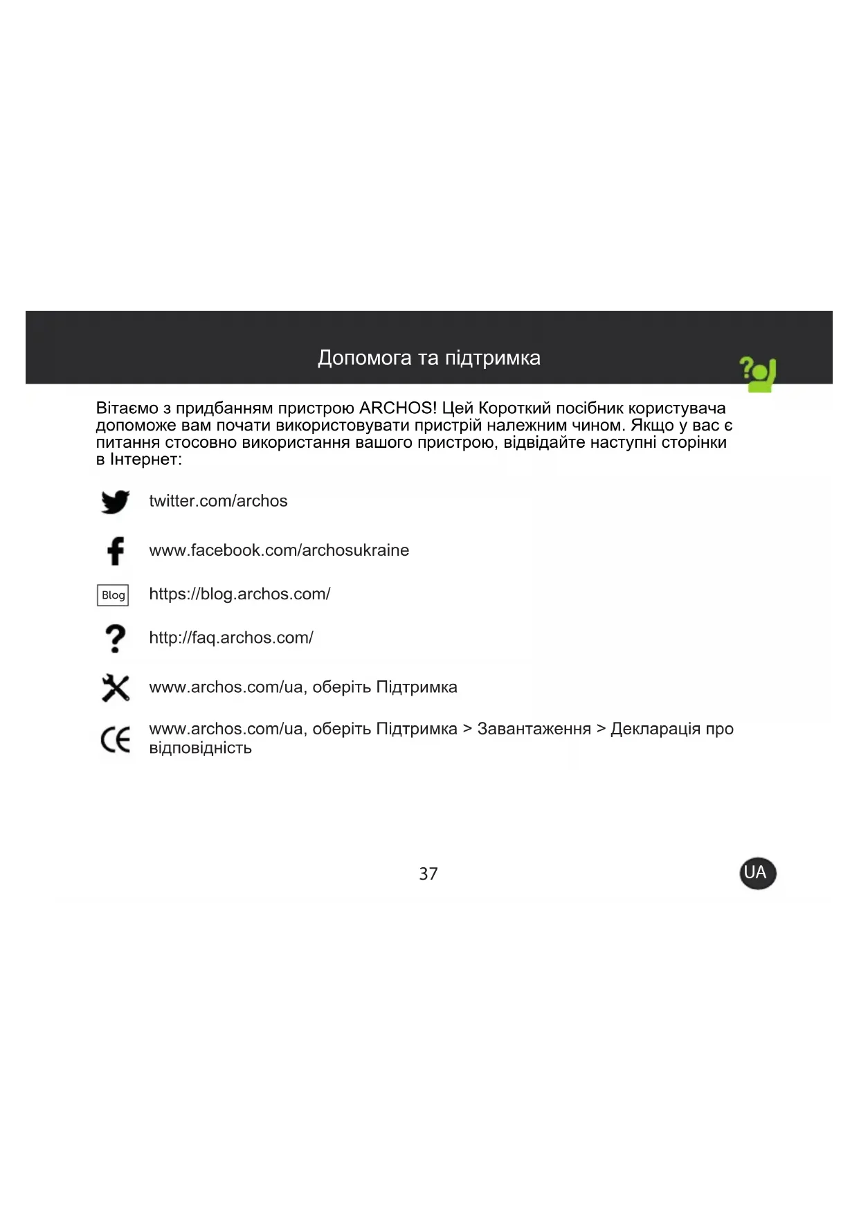 Допомога та підтримка Вітаємо з придбанням пристрою ARCHOS! Цей Короткий посібник користувача допоможе вам почати використовувати пристрій належним чином. Якщо у вас є питання стосовно використання вашого пристрою, відвідайте наступні сторінки в Інтернет: twitter.com/archos www.facebook.com/archosukraine Blog https://blog.archos.com/ http://faq.archos.com/ www.archos.com/ua, оберіть Підтримка www.archos.com/ua, оберіть Підтримка > Завантаження > Декларація про відповідність38 розпакування Hoverboard Короткий посібник39 Прочитайте уважно