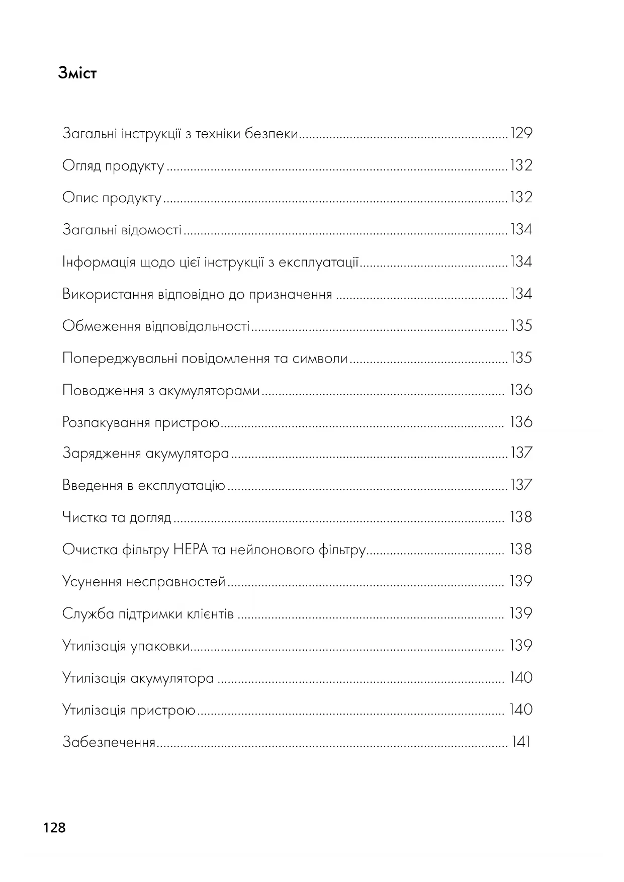 - Не занурюйте пристрій у воду або інші рідини. - Не експлуатуйте пристрій мокрими руками. - Уникайте попадання пристрою під дощ. - Не зберігайте пристрій під прямими сонячними променями або при високій вологості. - Не використовуйте цей пристрій, якщо один із отворів заблоковано. - Не використовуйте пристрій для збору легкозаймистих рідин, сірників, недопалків, гарячої золи або інших гарячих предметів, що спалюють або палять. - Не використовуйте цей пристрій, щоб підібрати тверді гострі предмети, такі як скло, цвяхи тощо.131