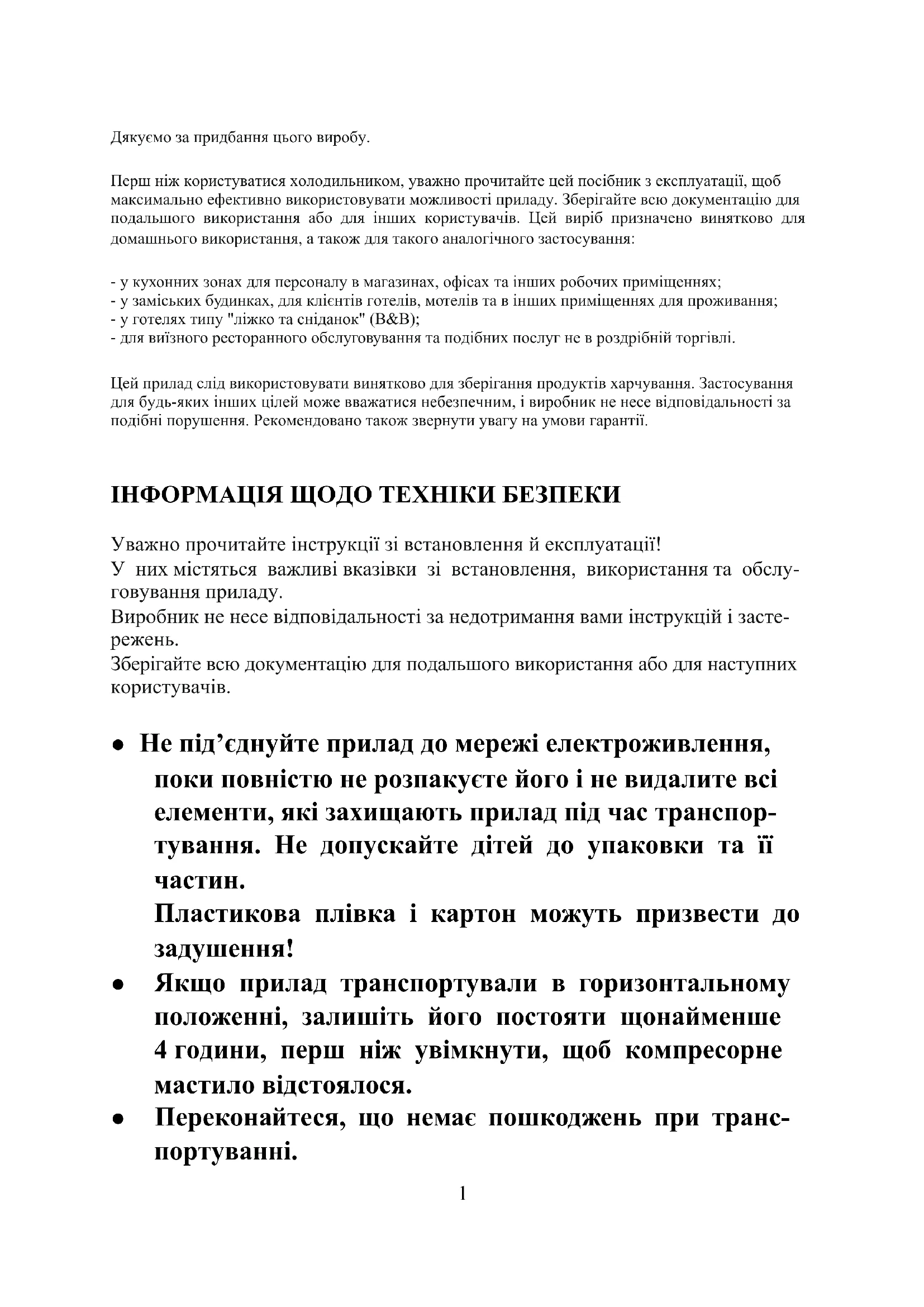 Дякуємо за придбання цього виробу. Перш ніж користуватися холодильником, уважно прочитайте цей посібник з експлуатації, щоб максимально ефективно використовувати можливості приладу. Зберігайте всю документацію для подальшого використання або для інших користувачів. Цей виріб призначено винятково для домашнього використання, а також для такого аналогічного застосування: - у кухонних зонах для персоналу в магазинах, офісах та інших робочих приміщеннях; - у заміських будинках, для клієнтів готелів, мотелів та в інших приміщеннях для проживання; - у готелях типу "ліжко та сніданок" (B&B); - для виїзного ресторанного обслуговування та подібних послуг не в роздрібній торгівлі. Цей прилад слід використовувати винятково для зберігання продуктів харчування. Застосування для будь-яких інших цілей може вважатися небезпечним, і виробник не несе відповідальності за подібні порушення. Рекомендовано також звернути увагу на умови гарантії. ІНФОРМАЦІЯ ЩОДО ТЕХНІКИ БЕЗПЕКИ Уважно прочитайте інструкції зі встановлення й експлуатації! У них містяться важливі вказівки зі встановлення, використання та обслу- говування приладу. Виробник не несе відповідальності за недотримання вами інструкцій і засте-
