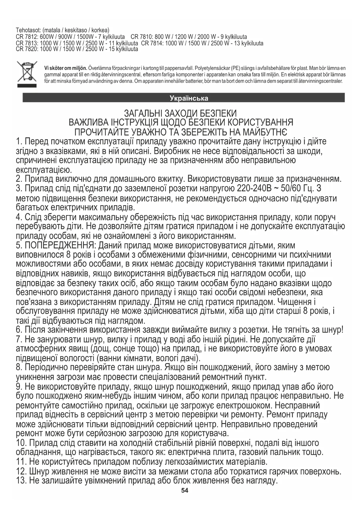 Вони можуть реагувати на пристрій та спричинити зміну кольору або навіть пошкодження. ТЕХНІЧНІ ДАНІ Джерело живлення: 220-240 В ~ 50/60 Гц Рівні потужності: (низький / середній / високий) CR 7812: 600 Вт / 900 Вт / 1500 Вт - 7 ребер CR 7810: 800 Вт / 1200 Вт / 2000 Вт - 9 ребер CR 7813: 1000 Вт / 1500 Вт / 2500 Вт - 11 ребер CR 7814: 1000 Вт / 1500 Вт / 2500 Вт - 13 ребер CR 7820: 1000 Вт / 1500 Вт / 2500 Вт - 15 ребер Svenska У інтересах навколишнього середовища. Будь ласка, віддайте картонну упаковку в місце збору мукулатури. Політиленові мішки (PE) викинути в смітник для пластику. Відпрацьований пристрій повинен бути відправлений у відповідну точку зберігання, тому що в пристрої є небезпечні інгредієнти, які можуть становити загрозу навколишньому середовищу. Електричний пристрій потрібно повернути так, щоб обмежити його повторне використання. Якщо у пристрої є батерейки, то потрібно їх витягнути і віддати до відповідного пунтку.