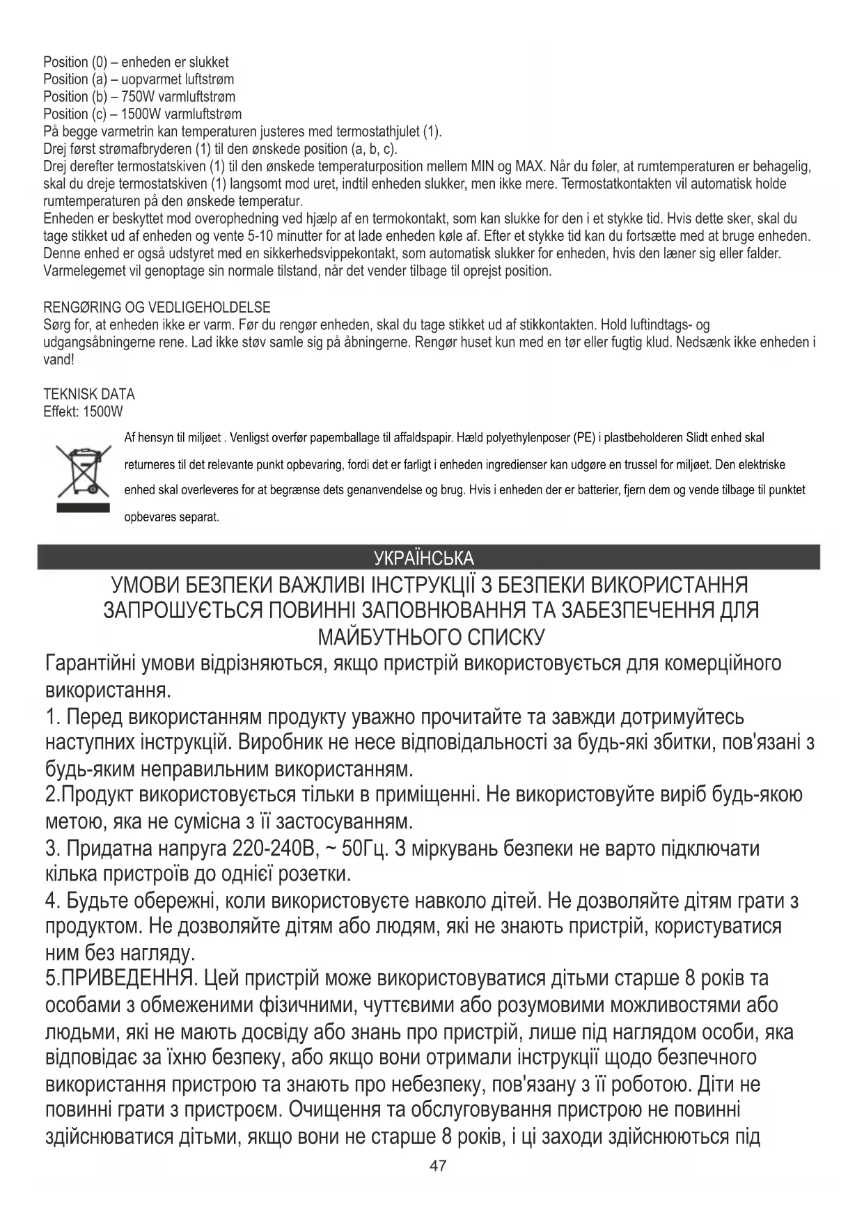 ВИКОРИСТАННЯ ПРИСТРОЮ Помістіть пристрій на рівну поверхню, залиште безпечну зону між пристроєм та іншими об’єктами на відстані 120 см спереду та на відстані 50 см з інших боків пристрою. Підключіть пристрій. Обігрівач має два рівні потужності нагріву і режим вентилятора. Позиція (0) – пристрій вимкнено Позиція (а) – потік ненагрітого повітря Позиція (b) – потік теплого повітря 750 Вт Позиція (в) – потік гарячого повітря 1500 Вт На обох рівнях нагріву температуру можна регулювати за допомогою регулятора термостата (1). Спочатку поверніть перемикач живлення (1) у потрібне положення (a, b, c). Потім поверніть регулятор термостата (1) у потрібну температуру між MIN і MAX. Коли ви відчуєте, що температура в кімнаті комфортна, повільно повертайте регулятор термостата (1) проти годинникової стрілки, поки пристрій не вимкнеться, але не більше. Термостат автоматично підтримуватиме температуру в приміщенні на бажаній температурі. Пристрій захищений від перегріву за допомогою термовимикача, який може вимкнути його на деякий час. Якщо це сталося, від’єднайте пристрій від мережі та зачекайте 5-10 хвилин, щоб він охолонув. Через деякий час ви можете продовжувати користуватися пристроєм. Цей пристрій також оснащений захисним перемикачем, який автоматично вимикає пристрій, якщо він нахиляється або падає. Обігрівач повернеться до нормального режиму, коли він повернеться у вертикальне положення. ОЧИЩЕННЯ ТА ОБСЛУГОВУВАННЯ Переконайтеся, що пристрій не гарячий. Перед очищенням пристрою вийміть вилку з розетки. Слідкуйте за чистотою впускних і вихідних отворів повітря. Не допускайте накопичення пилу на отворах. Очищайте корпус лише сухою або вологою тканиною. Не занурюйте пристрій у воду! ТЕХНІЧНІ ДАНІ Потужність: 1500 Вт Напруга: 220-240В ~50-60Гц Щоб захистити своє довкілля: відокреміть картонні коробки та поліетиленові пакети та викиньте їх у відповідні сміттєві контейнери. Використаний прилад слід доставити у спеціальні пункти збору через небезпечні компоненти, які можуть впливати на навколишнє середовище. Не викидайте цей прилад у загальний смітник.