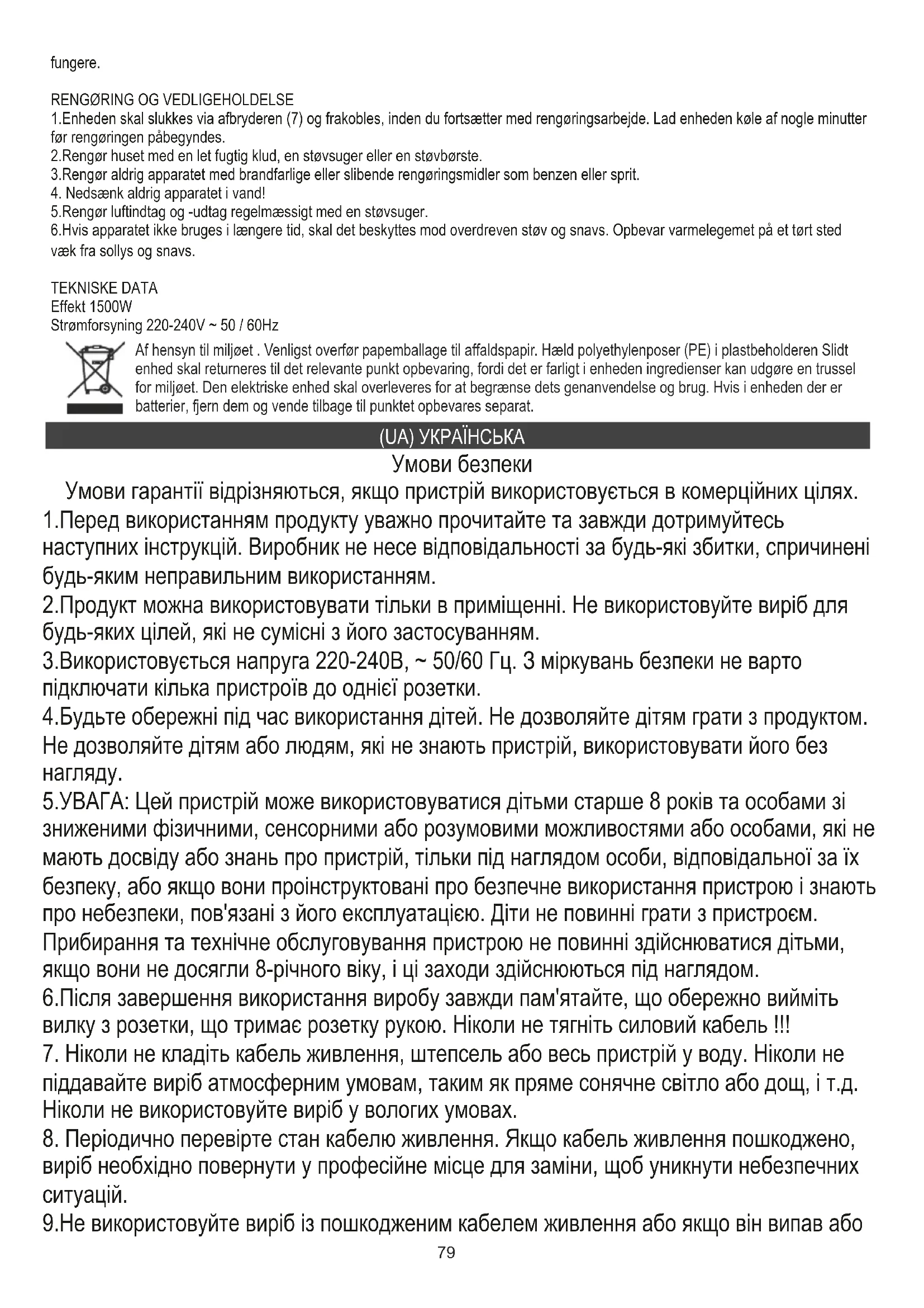 5.Rengør luftindtag og -udtag regelmæssigt med en støvsuger. 6.Hvis apparatet ikke bruges i længere tid, skal det beskyttes mod overdreven støv og snavs. Opbevar varmelegemet på et tørt sted væk fra sollys og snavs. TEKNISKE DATA Effekt 1500W Strømforsyning 220-240V ~ 50 / 60Hz (UA) УКРАЇНСЬКА Умови безпеки Умови гарантії відрізняються, якщо пристрій використовується в комерційних цілях. 1.Перед використанням продукту уважно прочитайте та завжди дотримуйтесь наступних інструкцій. Виробник не несе відповідальності за будь-які збитки, спричинені будь-яким неправильним використанням. 2.Продукт можна використовувати тільки в приміщенні. Не використовуйте виріб для будь-яких цілей, які не сумісні з його застосуванням. 3.Використовується напруга 220-240В, ~ 50/60 Гц. З міркувань безпеки не варто підключати кілька пристроїв до однієї розетки. 4.Будьте обережні під час використання дітей. Не дозволяйте дітям грати з продуктом. Не дозволяйте дітям або людям, які не знають пристрій, використовувати його без