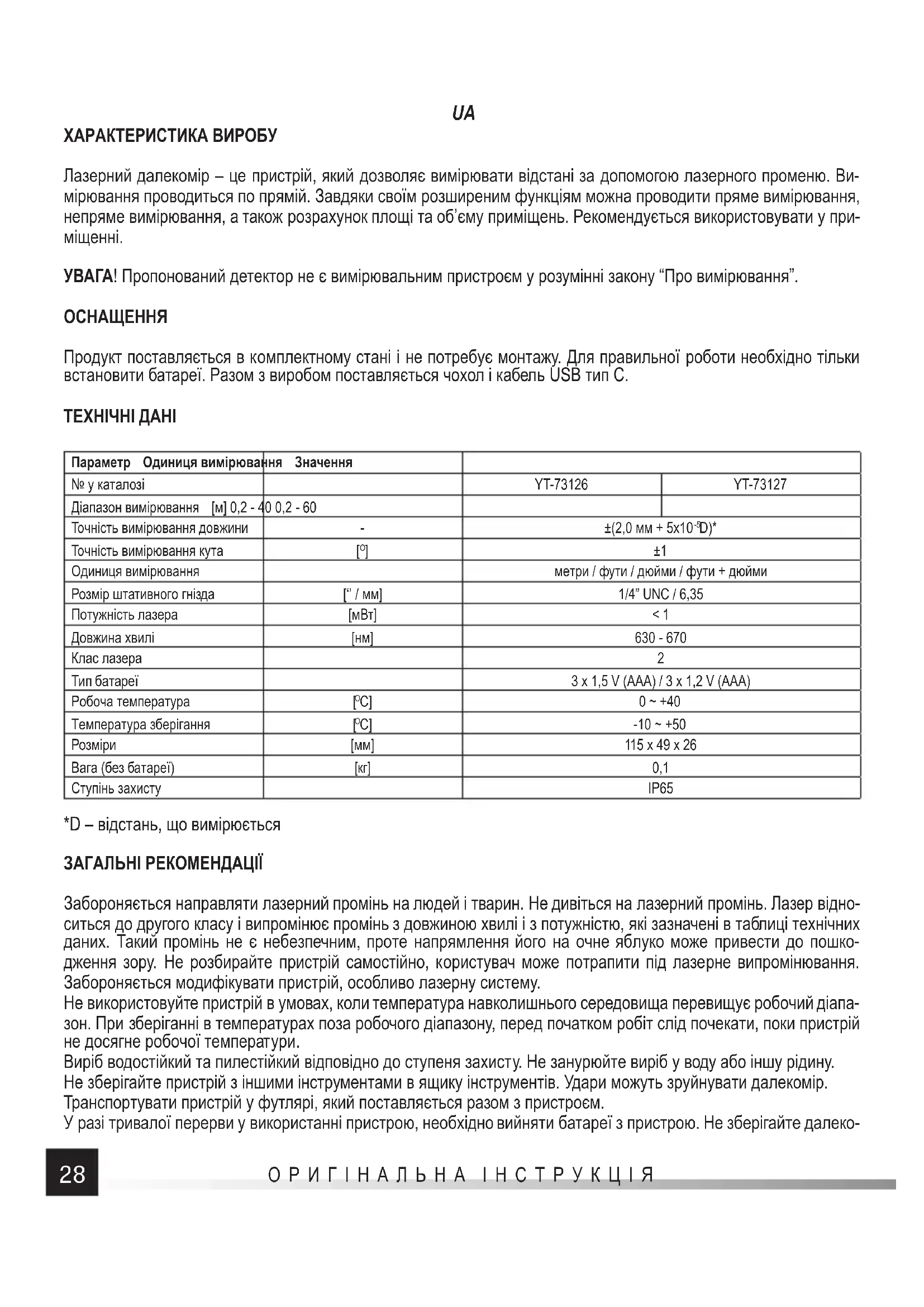 Продукт поставляється в комплектному стані і не потребує монтажу. Для правильної роботи необхідно тільки встановити батареї. Разом з виробом поставляється чохол і кабель USB тип C. ТЕХНІЧНІ ДАНІ Параметр Одиниця вимірювання Значення № у каталозі YT-73126 YT-73127 Діапазон вимірювання [м] 0,2 - 40 0,2 - 60 Точність вимірювання довжини - ±(2,0 мм + 5x10