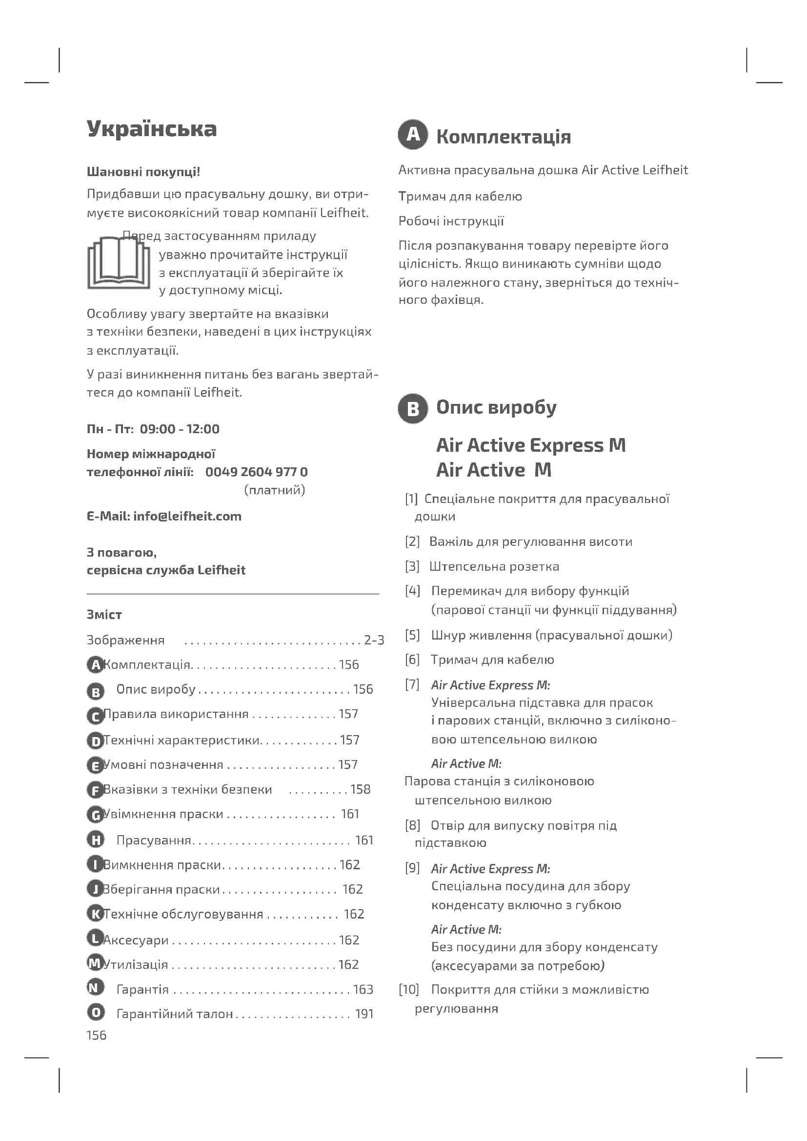 Шановні покупці! Придбавшицюпрасувальнудошку,виотри- муєтевисокоякіснийтоваркомпаніїLeifheit. Передзастосуваннямприладу уважнопрочитайтеінструкції зексплуатаціїйзберігайтеїх удоступномумісці. Особливуувагузвертайтенавказівки зтехнікибезпеки,наведенівцихінструкціях зексплуатації. Уразівиникненняпитаньбезваганьзвертай- тесядокомпаніїLeifheit. Пн - Пт: 09:00 - 12:00 Номер міжнародної телефонної лінії: 0049 2604 977 0