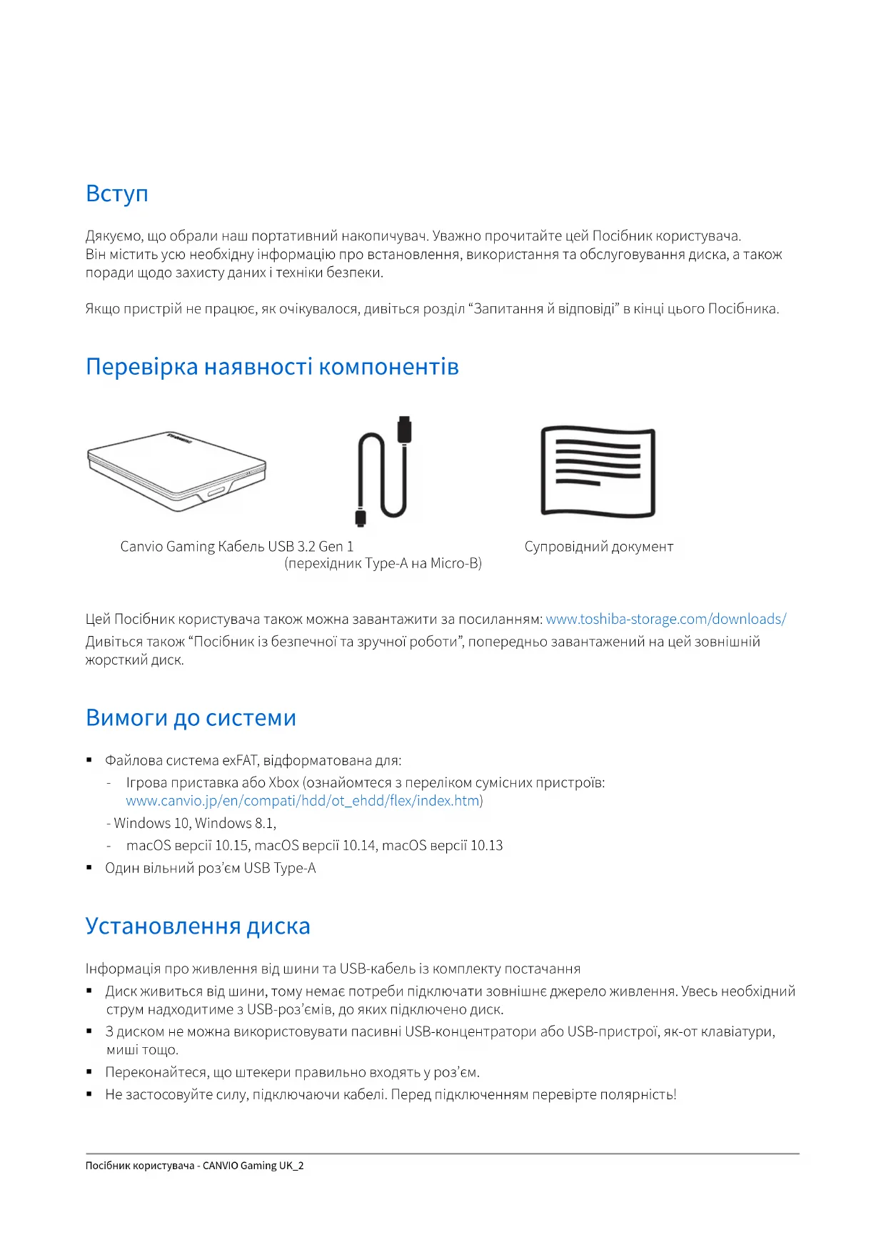 Дякумо, що обрали наш портативний накопичувач. Уважно прочитайте цей Посбник користувача. Внмстить усю необхдну нформацю про встановлення, використання та обслуговування диска, а також поради щодо захисту даних технки безпеки. кщо пристрй не працю, як очкувалося, дивться роздл “Запитання й вдповд” в кнц цього Посбника. Перевірка наявності компонентів ей Посбник користувача також можна завантажити за посиланням: www.toshiba-storage.com/downloads/ Дивться також “Посбник з безпечно та зручно роботи”, попередньо завантажений на цей зовншнй жорсткий диск. Вимоги до системи айлова система exFAT, вдформатована для: - грова приставка або Xbox (ознайомтеся з перелком сумсних пристров: www.canvio.jp/en/compati/hdd/ot_ehdd/flex/index.htm) - Windows 10, Windows 8.1, -macOSверс 10.15, macOS верс 10.14, macOS верс 10.13 Один вльний роз’м USB Type-A Установлення диска нформаця про живлення вд шини та USB-кабель з комплекту постачання Диск живиться вд шини, тому нема потреби пдключати зовншн джерело живлення. Увесь необхдний струм надходитиме з USB-роз’мв, до яких пдключено диск. З диском не можна використовувати пасивн USB-концентратори або USB-пристро, як-от клаватури,