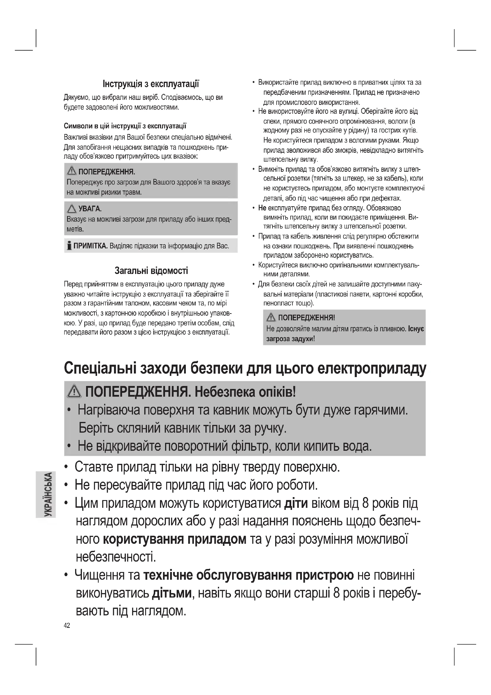 ПРИМІТКА. Виділяє підказки та інформацію для Вас. Загальні відомості Перед прийняттям в експлуатацію цього приладу дуже уважно читайте інструкцію з експлуатації та зберігайте її разом з гарантійним талоном, касовим чеком та, по мірі можливості, з картонною коробкою і внутрішньою упаков- кою. У разі, що прилад буде передано третім особам, слід передавати його разом з цією інструкцією з експлуатації. Спеціальні заходи безпеки для цього електроприладу ПОПЕРЕДЖЕННЯ. Небезпека опіків!