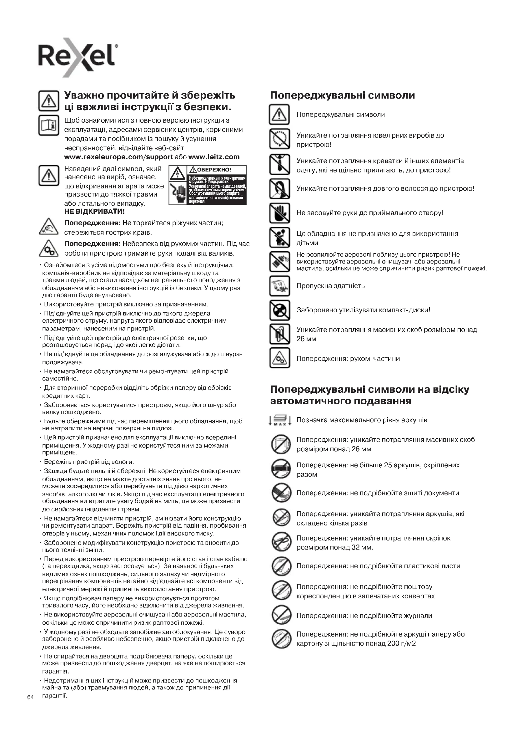 Уважно прочитайте й збережіть ці важливі інструкції з безпеки. Щоб ознайомитися з повною версією інструкцій з експлуатації, адресами сервісних центрів, корисними порадами та посібником із пошуку й усунення несправностей, відвідайте веб-сайт www.rexeleurope.com/support або www.leitz.com Уникайте потрапляння ювелірних виробів до