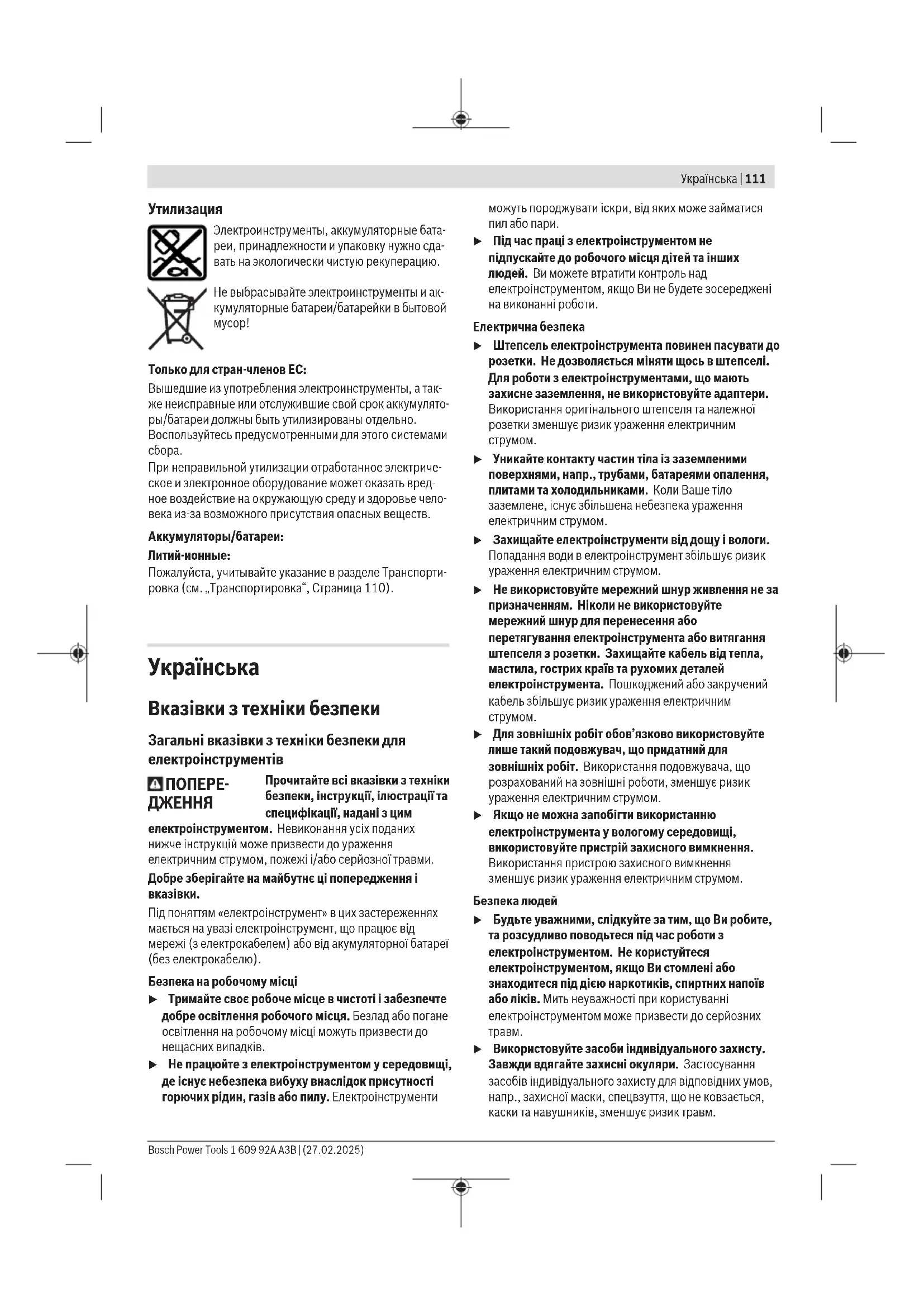 u Використовуйте засоби індивідуального захисту. Завжди вдягайте захисні окуляри. Застосування засобів індивідуального захисту для відповідних умов, напр.,захисної маски, спецвзуття, що не ковзається, каски та навушників, зменшує ризик травм. Bosch Power Tools 1 609 92A A3B | (27.02.2025)112 | Українська u Уникайте випадкового вмикання. Перш ніж увімкнути електроінструмент в електромережу або під’єднати акумуляторну батарею, брати його в руки або переносити, впевніться в тому, що електроінструмент вимкнений. Тримання пальця на вимикачі під час перенесення електроінструмента або підключення в розетку увімкнутого електроінструмента може призвести до травм. u Перед тим, як вмикати електроінструмент, приберіть налагоджувальні інструменти або гайковий ключ. Перебування налагоджувального інструмента або ключа в частині електроінструмента, що обертається, може призвести до травм. u Уникайте неприродного положення тіла. Завжди зберігайте стійке положення та тримайте рівновагу. Це дозволить Вам краще контролювати електроінструмент у небезпечних ситуаціях. u Вдягайте придатний одяг. Не вдягайте просторий одяг та прикраси. Не підставляйте волосся й одяг до деталей, що рухаються. Просторий одяг, довге волосся та прикраси можуть потрапити в деталі, що