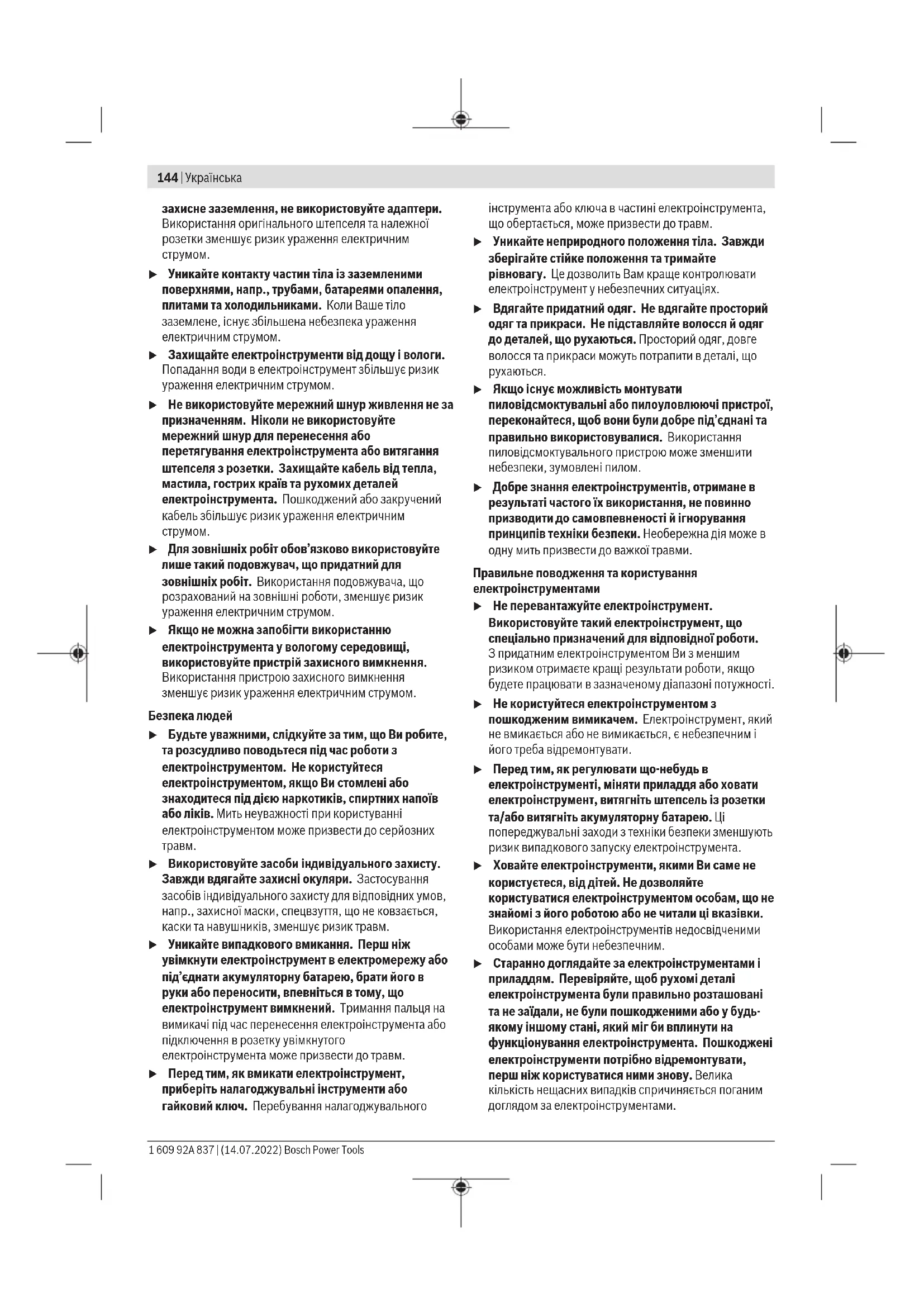 Під поняттям «електроінструмент» в цих застереженнях мається на увазі електроінструмент, що працює від мережі (з електрокабелем) або від акумуляторної батареї (без електрокабелю). Безпека на робочому місці u Тримайте своє робоче місце в чистоті і забезпечте добре освітлення робочого місця. Безлад або погане освітлення на робочому місці можуть призвести до нещасних випадків. u Не працюйте з електроінструментом у середовищі, де існує небезпека вибуху внаслідок присутності горючих рідин, газів або пилу. Електроінструменти можуть породжувати іскри, від яких може займатися пил або пари. u Під час праці з електроінструментом не підпускайте до робочого місця дітей та інших людей. Ви можете втратити контроль над електроінструментом, якщо Ви не будете зосереджені на виконанні роботи. Електрична безпека u Штепсель електроінструмента повинен пасувати до розетки. Не дозволяється міняти щось в штепселі. Для роботи з електроінструментами, що мають Bosch Power Tools 1 609 92A 837 | (14.07.2022)144 | Українська захисне заземлення, не використовуйте адаптери. Використання оригінального штепселя та належної розетки зменшує ризик ураження електричним