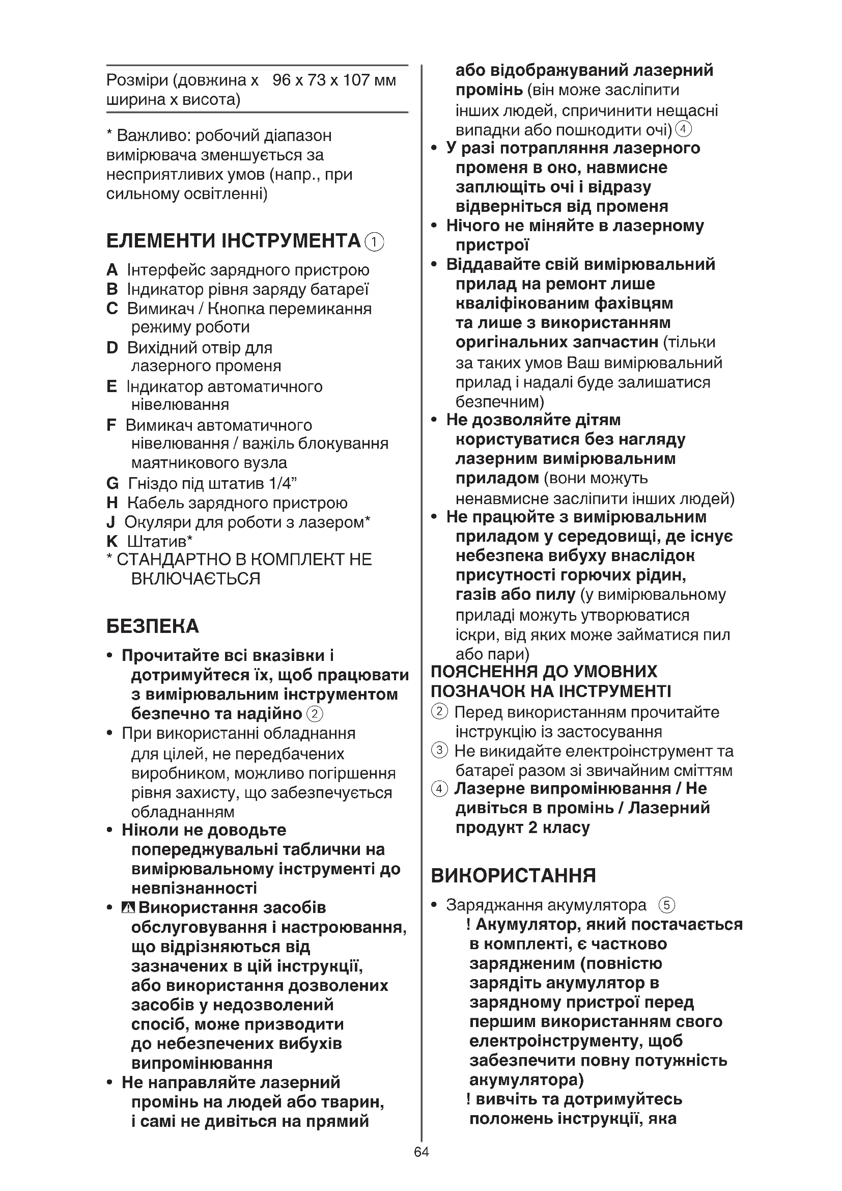 - Не направляйте лазерний промінь на людей або тварин, і самі не дивіться на прямий65 випромінювати лазерний промінь з вихідного отвору D ! не спрямовуйте лазерний промінь на людей і тварин і не дивіться у лазерний промінь, включаючи і з великої відстані - щоб вимкнути вимірювач, натисніть кнопку лазера C при використанні БЕЗ автоматичного нівелювання або відсуньте вимикач F в положення
