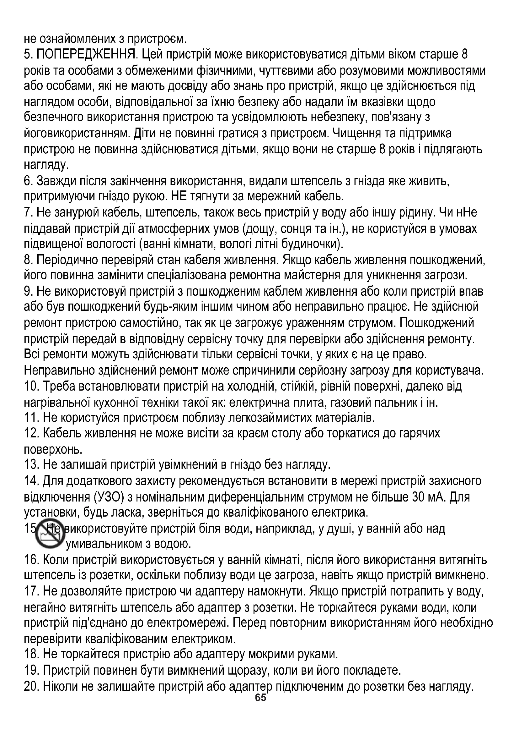 15. Не використовуйте пристрій біля води, наприклад, у душі, у ванній або над