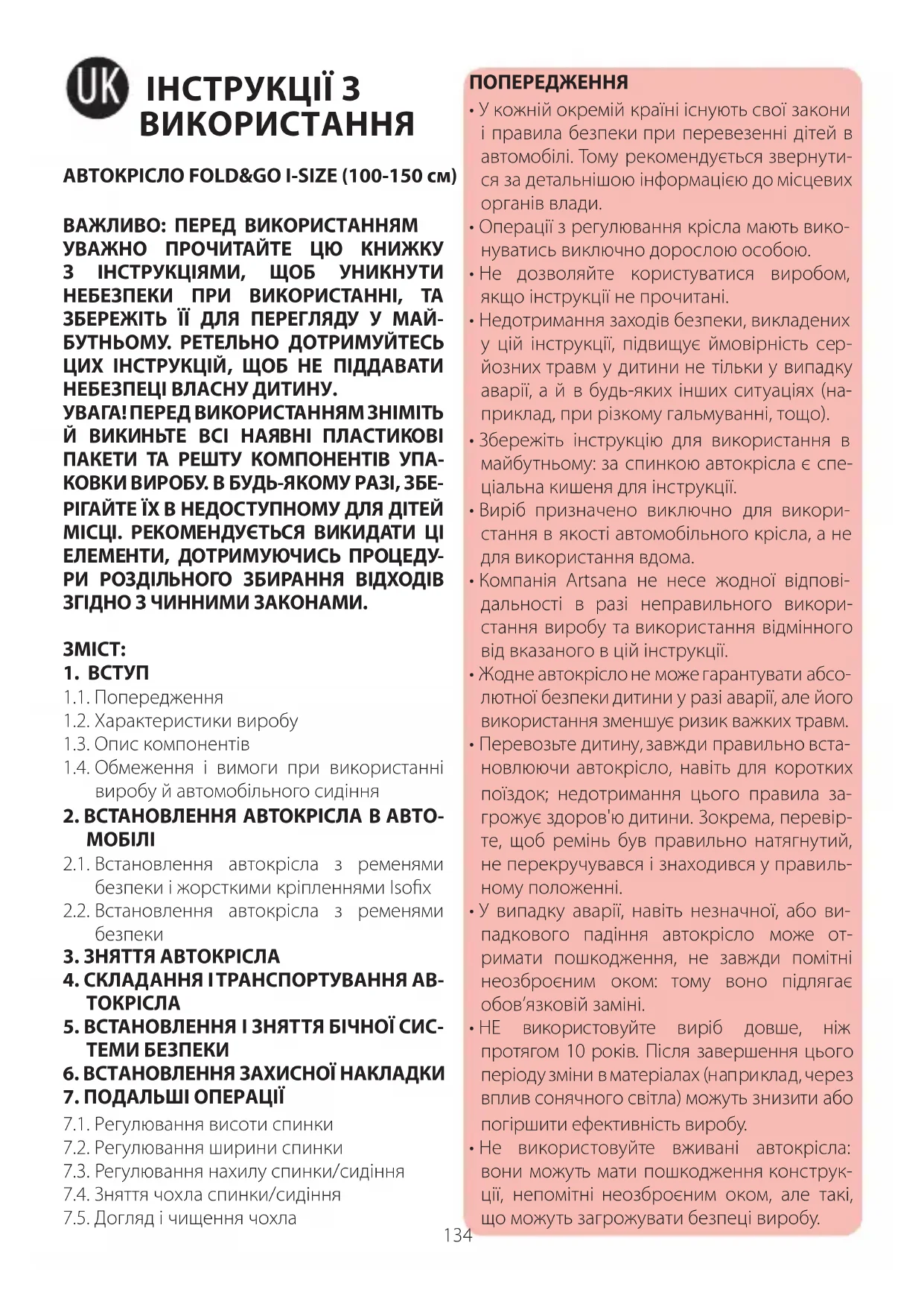 Гарантується відсутність дефектів виробу при нормальних умовах використання, пе- редбачених у інструкції з експлуатації. Відтак, гарантія не буде діяти в разі ушкоджень, що з'явилися внаслідок неправильної експлу- атації, зношення або випадкових подій. Про строк дії гарантії відповідності можна дізнатись з відповідних положень чинного національного законодавства країни, в якій придбано виріб, якщо вони передбачені. 30° C 30° C 30° C 30° C141 ИНСТРУКЦИЯ ПО ЭКСПЛУАТАЦИИ АВТОКРЕСЛО FOLD&GO I-SIZE (100-150 см) ОЧЕНЬ ВАЖНО: В ЦЕЛЯХ ОБЕСПЕЧЕНИЯ БЕЗОПАСНОСТИ ВНИМАТЕЛЬНО ПРО- ЧИТАЙТЕ ДАННУЮ ИНСТРУКЦИЮ ПЕРЕД ИСПОЛЬЗОВАНИЕМ ИЗДЕЛИЯ И СОХРА- НИТЕ ЕЁ ДЛЯ ПОСЛЕДУЮЩИХ КОНСУЛЬ- ТАЦИЙ. СТРОГО СЛЕДУЙТЕ УКАЗАНИЯМ, ЧТОБЫ НЕ ПОСТАВИТЬ ПОД УГРОЗУ БЕЗ- ОПАСНОСТЬ РЕБЁНКА. ВНИМАНИЕ! ПЕРЕД ИСПОЛЬЗОВАНИЕМ СНИМИТЕ С ИЗДЕЛИЯ ВСЕ ВОЗМОЖНЫЕ ПЛАСТИКОВЫЕ ПАКЕТЫ И ЭЛЕМЕНТЫ УПАКОВКИ И ДЕРЖИТЕ ИХ ВДАЛИ ОТ ДЕТЕЙ. РЕКОМЕНДУЕТСЯ УТИЛИЗИРО- ВАТЬ ДАННЫЕ КОМПОНЕНТЫ ПО ПРИН- ЦИПУ ДИФФЕРЕНЦИРОВАННОГО СБОРА МУСОРА В СООТВЕТСТВИИ С ДЕЙСТВУЮ- ЩИМИ ЗАКОНАМИ. СОДЕРЖАНИЕ: