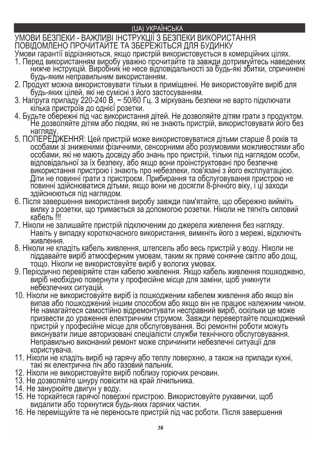 16. Не переміщуйте та не переносьте пристрій під час роботи. Після завершення