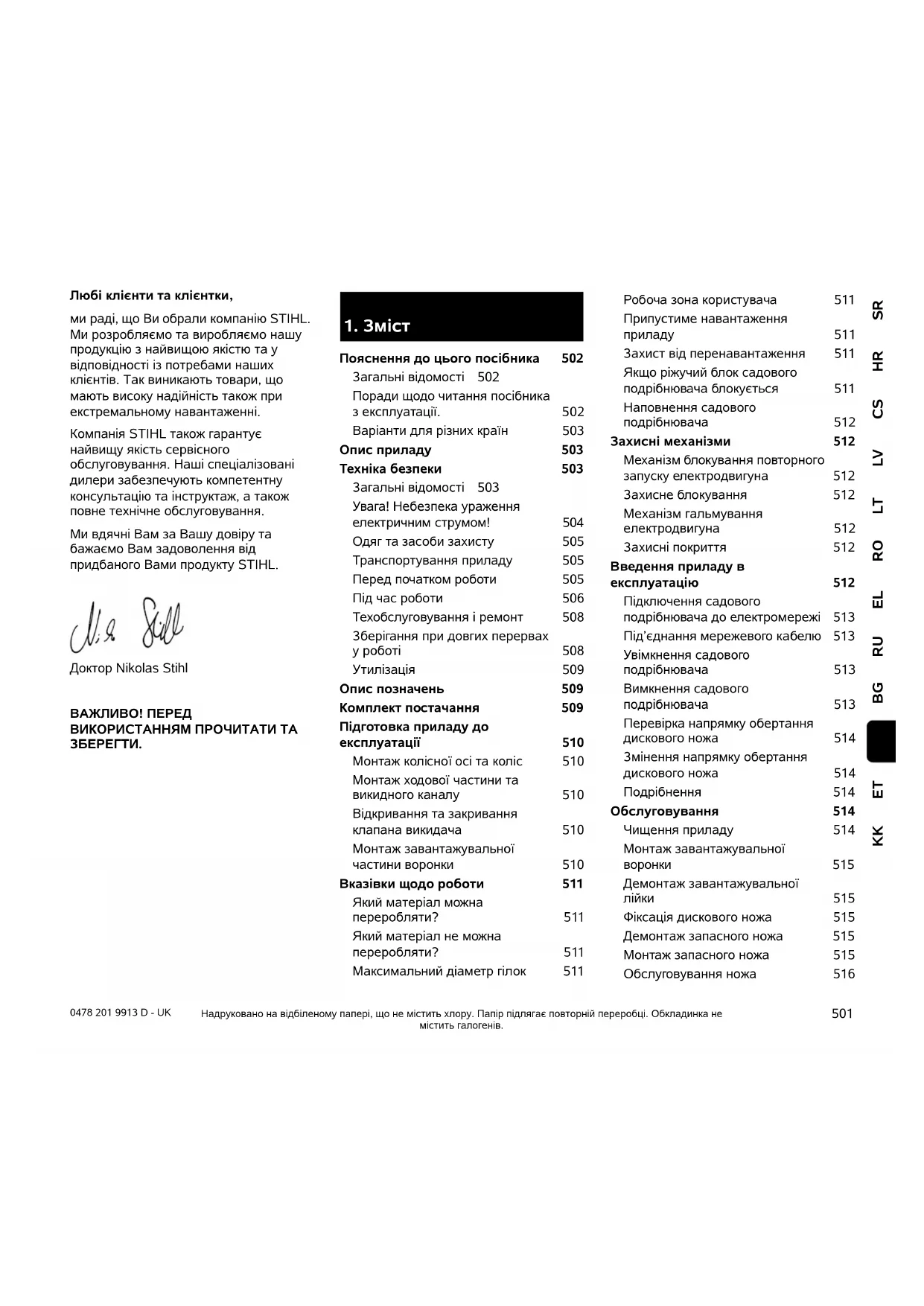 Пояснення до цього посібника 502 Загальні відомості 502 Поради щодо читання посібника з експлуатації.502 Варіанти для різних країн 503 Опис приладу 503 Техніка безпеки 503 Загальні відомості 503 Увага! Небезпека ураження електричним струмом!504 Одяг та засоби захисту 505 Транспортування приладу 505 Перед початком роботи 505 Під час роботи 506 Техобслуговування і ремонт 508 Зберігання при довгих перервах у роботі 508 Утилізація 509 Опис позначень 509 Комплект постачання 509 Підготовка приладу до експлуатації 510 Монтаж колісної осі та коліс 510 Монтаж ходової частини та викидного каналу 510 Відкривання та закривання клапана викидача 510 Монтаж завантажувальної частини воронки 510 Вказівки щодо роботи 511 Який матеріал можна переробляти?511 Який матеріал не можна переробляти?511 Максимальний діаметр гілок 511 Робоча зона користувача 511 Припустиме навантаження приладу 511 Захист від перенавантаження 511 Якщо ріжучий блок садового подрібнювача блокується 511 Наповнення садового подрібнювача 512 Захисні механізми 512 Механізм блокування повторного запуску електродвигуна 512 Захисне блокування 512 Механізм гальмування електродвигуна 512 Захисні покриття 512 Введення приладу в експлуатацію 512 Підключення садового подрібнювача до електромережі 513 Під’єднання мережевого кабелю 513 Увімкнення садового подрібнювача 513 Вимкнення садового подрібнювача 513 Перевірка напрямку обертання дискового ножа 514 Змінення напрямку обертання дискового ножа 514 Подрібнення 514 Обслуговування 514 Чищення приладу 514 Монтаж завантажувальної воронки 515 Демонтаж завантажувальної лійки 515 Фіксація дискового ножа 515 Демонтаж запасного ножа 515 Монтаж запасного ножа 515 Обслуговування ножа 5160478 201 9913 D - UK
