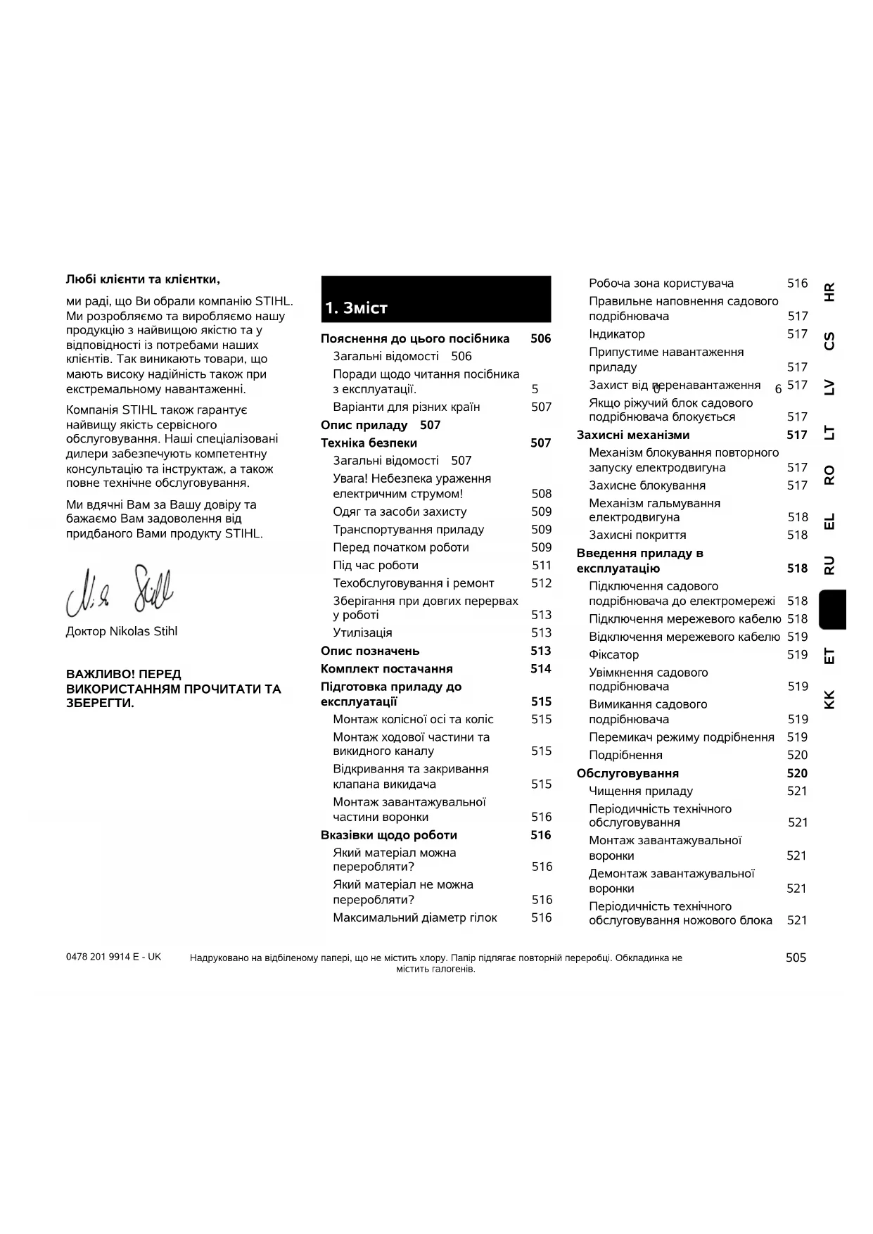 Пояснення до цього посібника 506 Загальні відомості 506 Поради щодо читання посібника з експлуатації.506 Варіанти для різних країн 507 Опис приладу 507 Техніка безпеки 507 Загальні відомості 507 Увага! Небезпека ураження електричним струмом!508 Одяг та засоби захисту 509 Транспортування приладу 509 Перед початком роботи 509 Під час роботи 511 Техобслуговування і ремонт 512 Зберігання при довгих перервах у роботі 513 Утилізація 513 Опис позначень 513 Комплект постачання 514 Підготовка приладу до експлуатації 515 Монтаж колісної осі та коліс 515 Монтаж ходової частини та викидного каналу 515 Відкривання та закривання клапана викидача 515 Монтаж завантажувальної частини воронки 516 Вказівки щодо роботи 516 Який матеріал можна переробляти?516 Який матеріал не можна переробляти?516 Максимальний діаметр гілок 516 Робоча зона користувача 516 Правильне наповнення садового подрібнювача 517 Індикатор 517 Припустиме навантаження приладу 517 Захист від перенавантаження 517 Якщо ріжучий блок садового подрібнювача блокується 517 Захисні механізми 517 Механізм блокування повторного запуску електродвигуна 517 Захисне блокування 517 Механізм гальмування електродвигуна 518 Захисні покриття 518 Введення приладу в експлуатацію 518 Підключення садового подрібнювача до електромережі 518 Підключення мережевого кабелю 518 Відключення мережевого кабелю 519 Фіксатор 519 Увімкнення садового подрібнювача 519 Вимикання садового подрібнювача 519 Перемикач режиму подрібнення 519 Подрібнення 520 Обслуговування 520 Чищення приладу 521 Періодичність технічного обслуговування 521 Монтаж завантажувальної воронки 521 Демонтаж завантажувальної воронки 521 Періодичність технічного обслуговування ножового блока 5210478 201 9914 E - UK