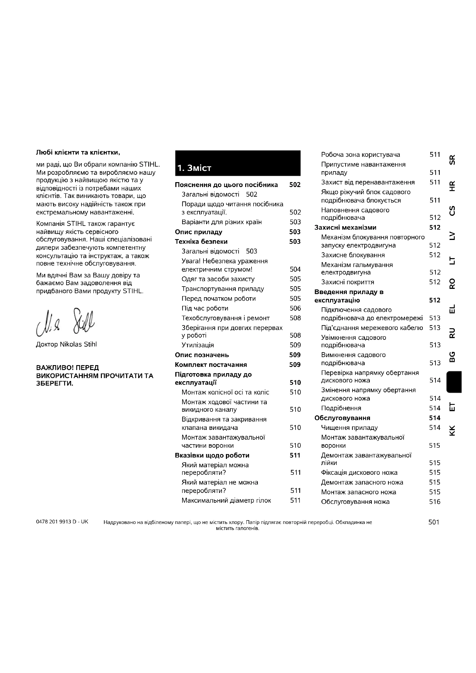 Пояснення до цього посібника 502 Загальні відомості 502 Поради щодо читання посібника з експлуатації.502 Варіанти для різних країн 503 Опис приладу 503 Техніка безпеки 503 Загальні відомості 503 Увага! Небезпека ураження електричним струмом!504 Одяг та засоби захисту 505 Транспортування приладу 505 Перед початком роботи 505 Під час роботи 506 Техобслуговування і ремонт 508 Зберігання при довгих перервах у роботі 508 Утилізація 509 Опис позначень 509 Комплект постачання 509 Підготовка приладу до експлуатації 510 Монтаж колісної осі та коліс 510 Монтаж ходової частини та викидного каналу 510 Відкривання та закривання клапана викидача 510 Монтаж завантажувальної частини воронки 510 Вказівки щодо роботи 511 Який матеріал можна переробляти?511 Який матеріал не можна переробляти?511 Максимальний діаметр гілок 511 Робоча зона користувача 511 Припустиме навантаження приладу 511 Захист від перенавантаження 511 Якщо ріжучий блок садового подрібнювача блокується 511 Наповнення садового подрібнювача 512 Захисні механізми 512 Механізм блокування повторного запуску електродвигуна 512 Захисне блокування 512 Механізм гальмування електродвигуна 512 Захисні покриття 512 Введення приладу в експлуатацію 512 Підключення садового подрібнювача до електромережі 513 Під’єднання мережевого кабелю 513 Увімкнення садового подрібнювача 513 Вимкнення садового подрібнювача 513 Перевірка напрямку обертання дискового ножа 514 Змінення напрямку обертання дискового ножа 514 Подрібнення 514 Обслуговування 514 Чищення приладу 514 Монтаж завантажувальної воронки 515 Демонтаж завантажувальної лійки 515 Фіксація дискового ножа 515 Демонтаж запасного ножа 515 Монтаж запасного ножа 515 Обслуговування ножа 5160478 201 9913 D - UK