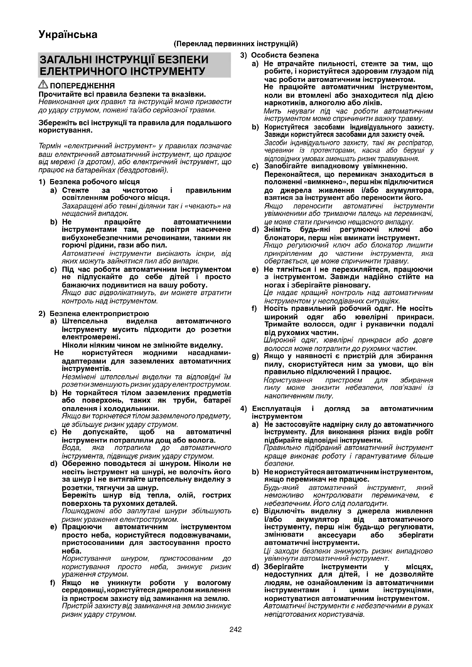 аксесуари або зберігати автоматичні інструменти. Ці заходи безпеки знижують ризик випадково увімкнути автоматичний інструмент. d) Зберігайте інструменти у місцях, недоступних для дітей, і не дозволяйте людям, не ознайомленим із автоматичними інструментами і цими інструкціями, користуватися автоматичним інструментом. Автоматичні інструменти є небезпечними в руках непідготованих користувачів. ЗАГАЛЬНІ ІНСТРУКЦІЇ БЕЗПЕКИ ЕЛЕКТРИЧНОГО ІНСТРУМЕНТУ ПОПЕРЕДЖЕННЯ Прочитайте всі правила безпеки та вказівки. Невиконання цих правил та інструкцій може призвести до удару струмом, пожежі та/або серйозної травми. Збережіть всі інструкції та правила для подальшого користування. Термін «електричний інструмент» у правилах позначає ваш електричний автоматичний інструмент, що працює від мережі (з дротом), або електричний інструмент, що