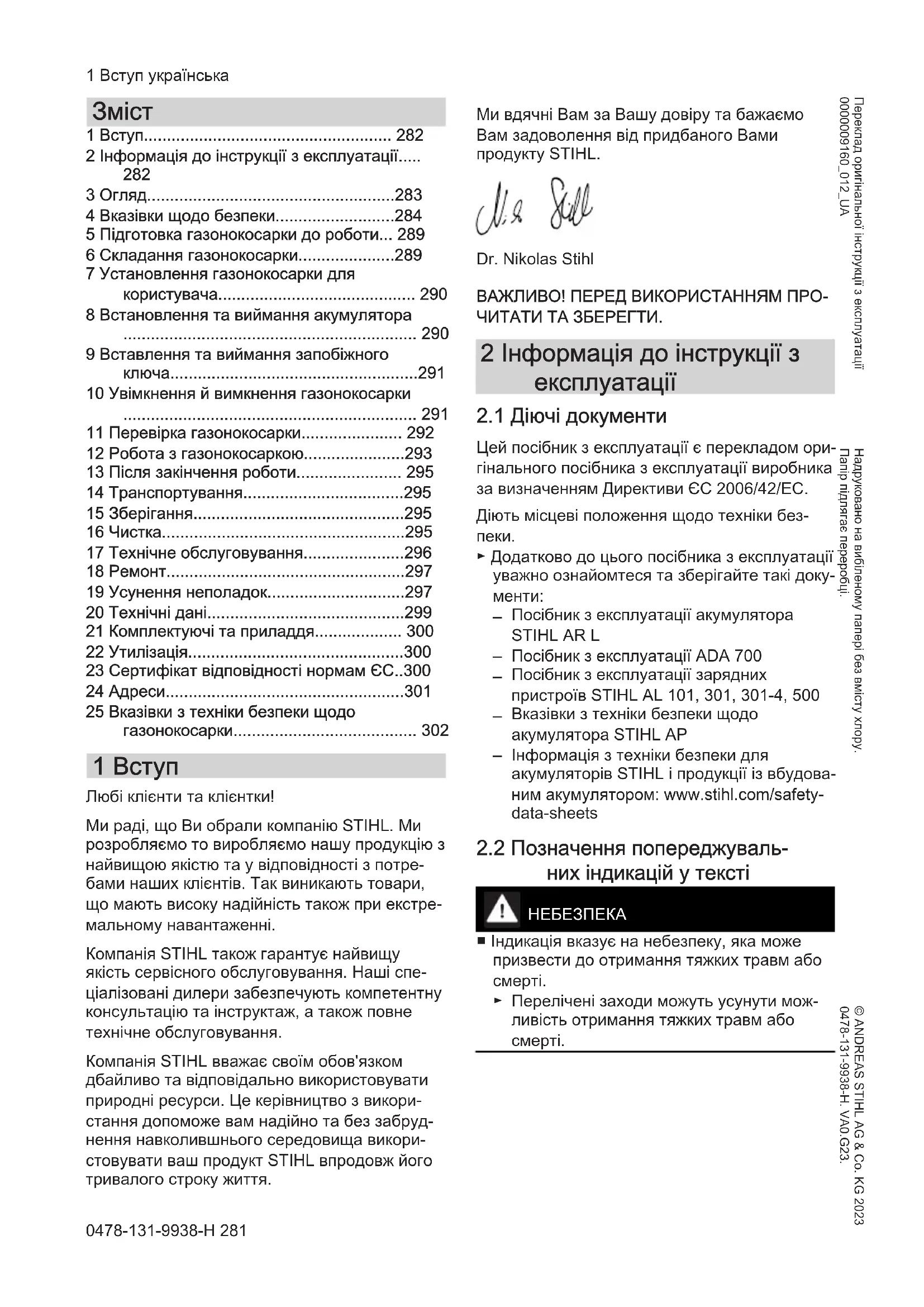 280 0478-131-9938-H© ANDREAS STIHL AG & Co. KG 2023 0478-131-9938-H. VA0.G23. Надруковано на вибіленому папері без вмісту хлору. Папір підлягає переробці. Переклад оригінальної інструкції з експлуатації 0000009160_012_UA
