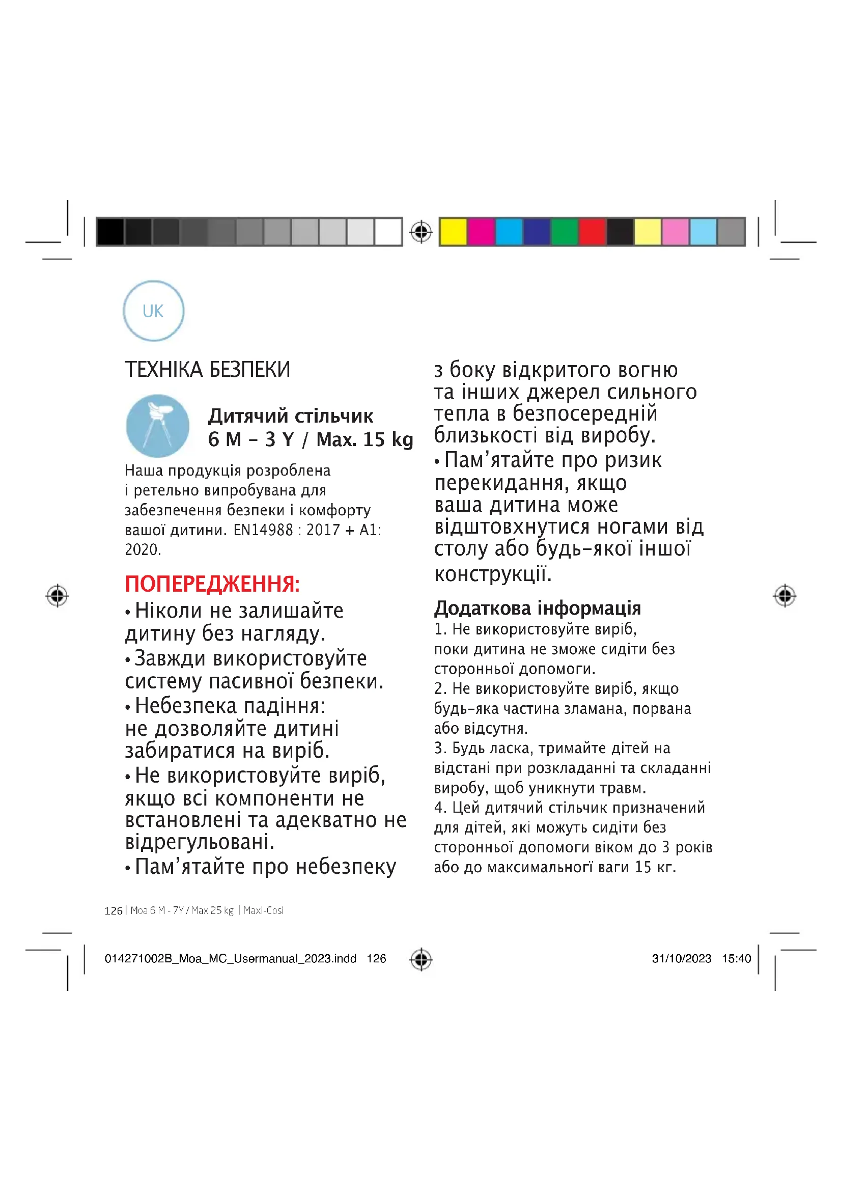 Maxi-Cosi ТЕХНІКА БЕЗПЕКИ Дитячий стільчик 6 M - 3 Y / Max. 15 kg Наша продукція розроблена і ретельно випробувана для забезпечення безпеки і комфорту вашої дитини. EN14988 : 2017 + A1: