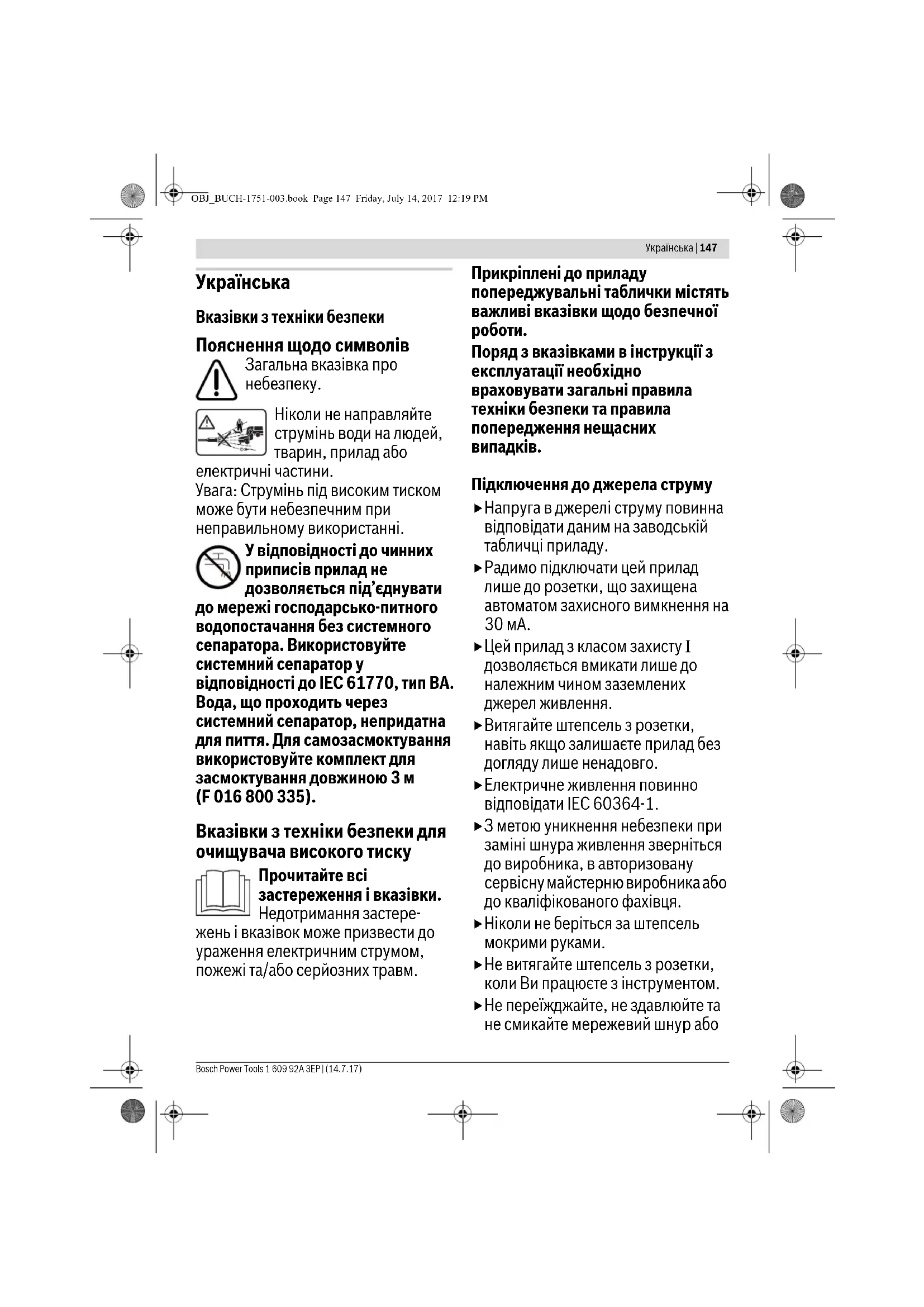 Не використовуйте очищувач високого тиску без фільтра, з брудним або з пошкодженим фільтром. При використанні очищувача високого тиску без фільтра або з брудним чи OBJ_BUCH-1751-003.book Page 149 Friday, July 14, 2017 12:19 PM150 | Українська 1 609 92A 3EP | (14.7.17) Bosch Power Tools пошкодженим фільтром гарантія втрачається. Металеві деталі можуть нагріватися після тривалої експлуатації. За необхідності вдягайте захисні
