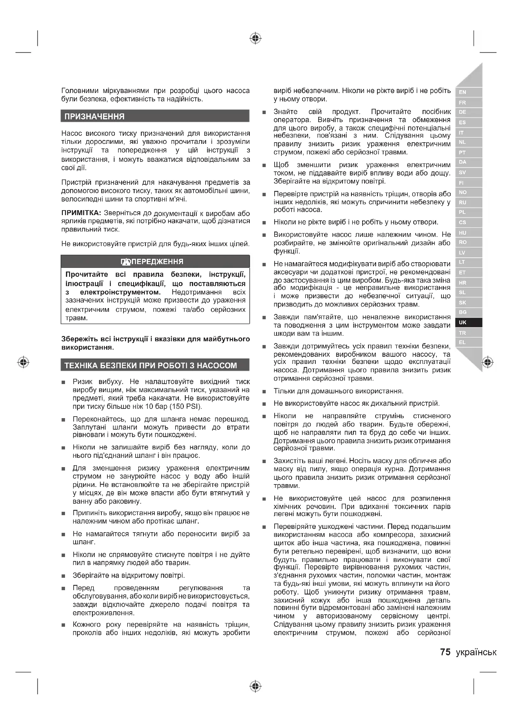 Збережіть всі інструкції і вказівки для майбутнього використання. ТЕХНІКА БЕЗПЕКИ ПРИ РОБОТІ З НАСОСОМ ■ Ризик вибуху. Не налаштовуйте вихідний тиск виробу вищим, ніж максимальний тиск, указаний на предметі, який треба накачати. Не використовуйте при тиску більше ніж 10 бар (150 PSI). ■ Переконайтесь, що для шланга немає перешкод. Заплутані шланги можуть привести до втрати рівноваги і можуть бути пошкоджені. ■ Ніколи не залишайте виріб без нагляду, коли до нього під'єднаний шланг і він працює. ■ Для зменшення ризику ураження електричним струмом не занурюйте насос у воду або іншій рідини. Не встановлюйте та не зберігайте пристрій у місцях, де він може впасти або бути втягнутий у ванну або раковину. ■ Припиніть використання виробу, якщо він працює не належним чином або протікає шланг. ■ Не намагайтеся тягнути або переносити виріб за
