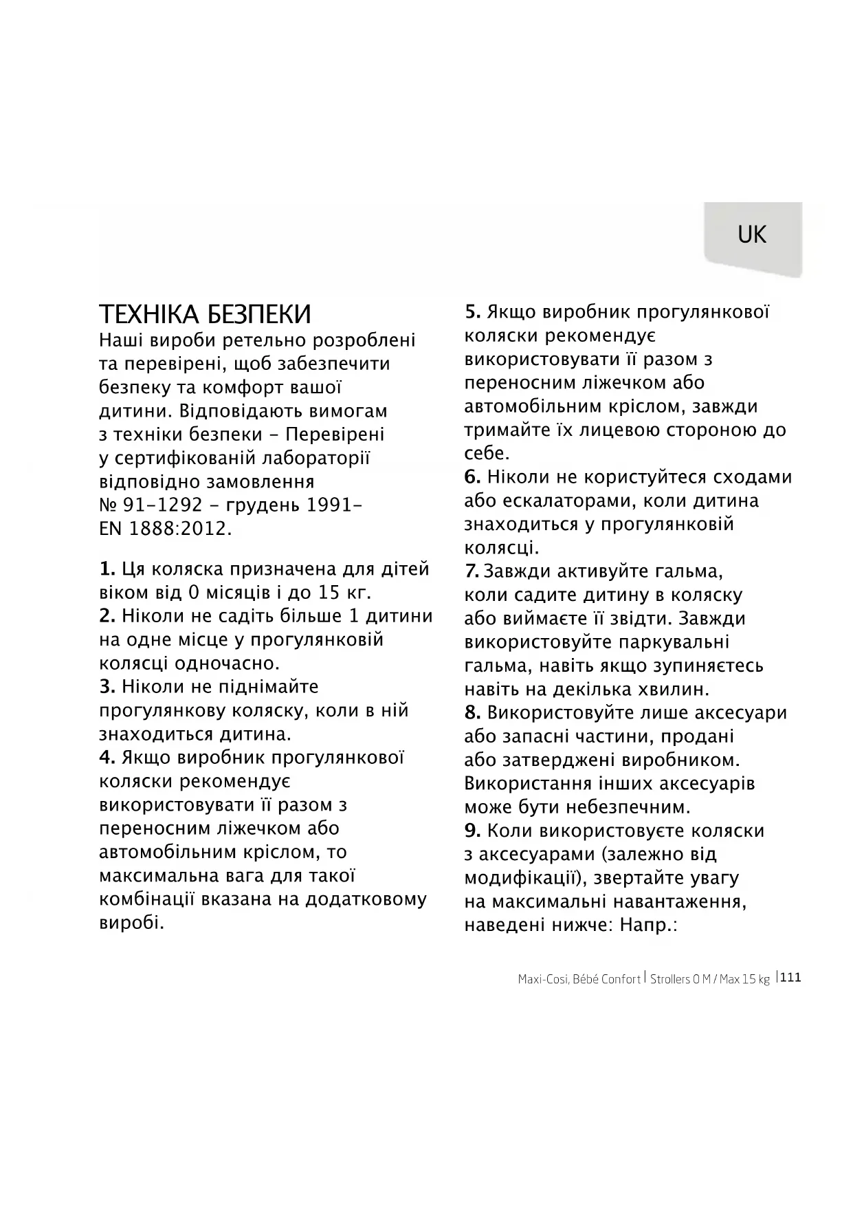 ТЕХНІКА БЕЗПЕКИ Наші вироби ретельно розроблені та перевірені, щоб забезпечити безпеку та комфорт вашої дитини. Відповідають вимогам з техніки безпеки - Перевірені у сертифікованій лабораторії відповідно замовлення № 91-1292 - грудень 1991- EN 1888:2012.