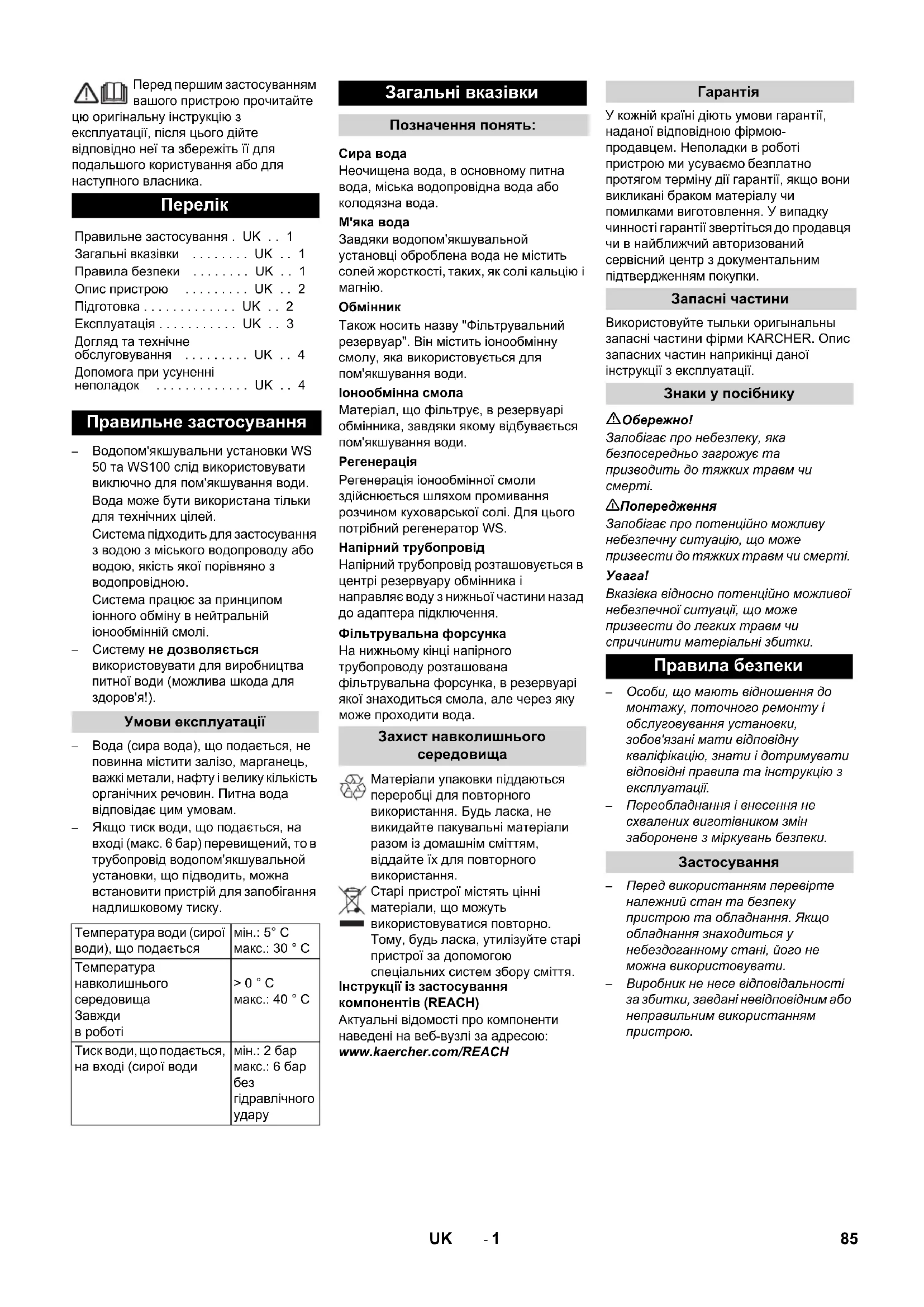 5 10,0 20,0 10 5,0 10,0 12 4,2 8,3 14 3,6 7,1 16 3,1 6,3 18 2,8 5,6 20 2,5 5,0 22 2,3 4,5 Matavimo prietaisas Regeneracija Išsieikvojusios sistemos regeneravimas Dervos užpildo keitimas talpykloje Priežiūra ir aptarnavimas Bendrieji nurodymai Užšalimo pavojus Talpyklos ištuštinimas dėl užšalimo pa- vojaus Aptarnavimo darbai Kasdienės patikros prieš naudojimą Techninės priežiūros darbai kas 3 mėne- sius Pagalba atsiradus gedimų Nėra suminkštinto vandens Išbėga derva Nesandarumas 84 LT- 1 Перед першим застосуванням вашого пристрою прочитайте цю оригінальну інструкцію з експлуатації, після цього дійте відповідно неї та збережіть її для подальшого користування або для наступного власника. – Водопом'якшувальни установки WS 50 та WS100 слід використовувати виключно для пом'якшування води. Вода може бути використана тільки для технічних цілей. Система підходить для застосування з водою з міського водопроводу або водою, якість якої порівняно з водопровідною. Система працює за принципом іонного обміну в нейтральній іонообмінній смолі. – Систему не дозволяється використовувати для виробництва питної води (можлива шкода для здоров'я!). – Вода (сира вода), що подається, не повинна містити залізо, марганець, важкі метали, нафту і велику кількість органічних речовин. Питна вода відповідає цим умовам. – Якщо тиск води, що подається, на вході (макс. 6 бар) перевищений, то в трубопровід водопом'якшувальной установки, що підводить, можна встановити пристрій для запобігання надлишковому тиску. Неочищена вода, в основному питна вода, міська водопровідна вода або колодязна вода. Завдяки водопом'якшувальной установці оброблена вода не містить солей жорсткості, таких, як солі кальцію