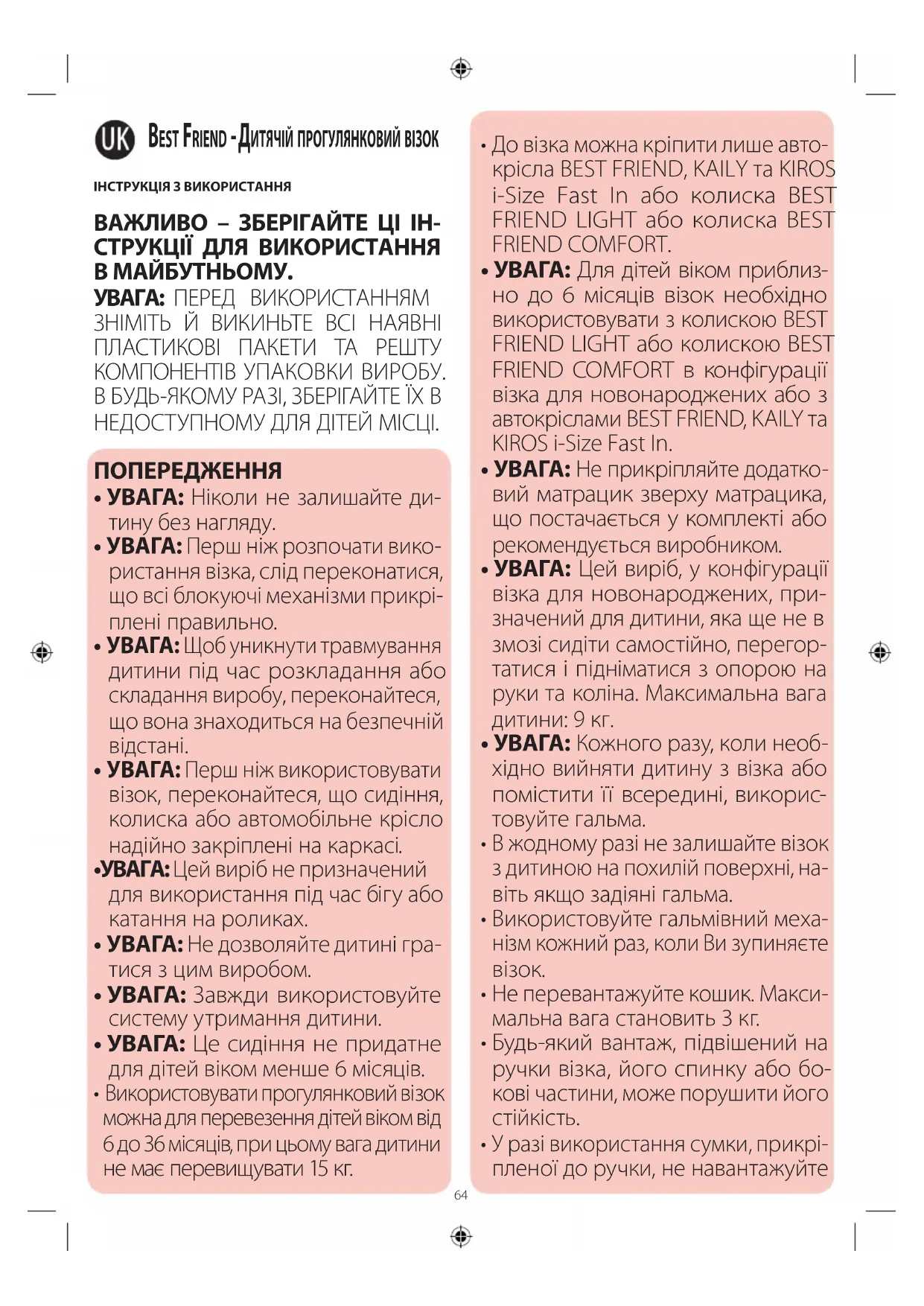 - УВАГА: Для дітей віком приблиз- но до 6 місяців візок необхідно використовувати з колискою BEST FRIEND LIGHT або колискою BEST FRIEND COMFORT в конфігурації візка для новонароджених або з автокріслами BEST FRIEND, KAILY та KIROS i-Size Fast In.