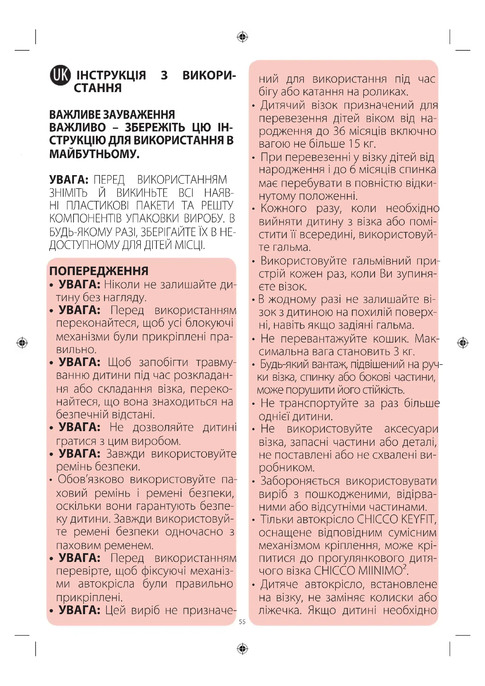 - Тільки автокрісло CHICCO KEYFIT, оснащене відповідним сумісним механізмом кріплення, може крі- питися до прогулянкового дитя- чого візка CHICCO MIINIMO².