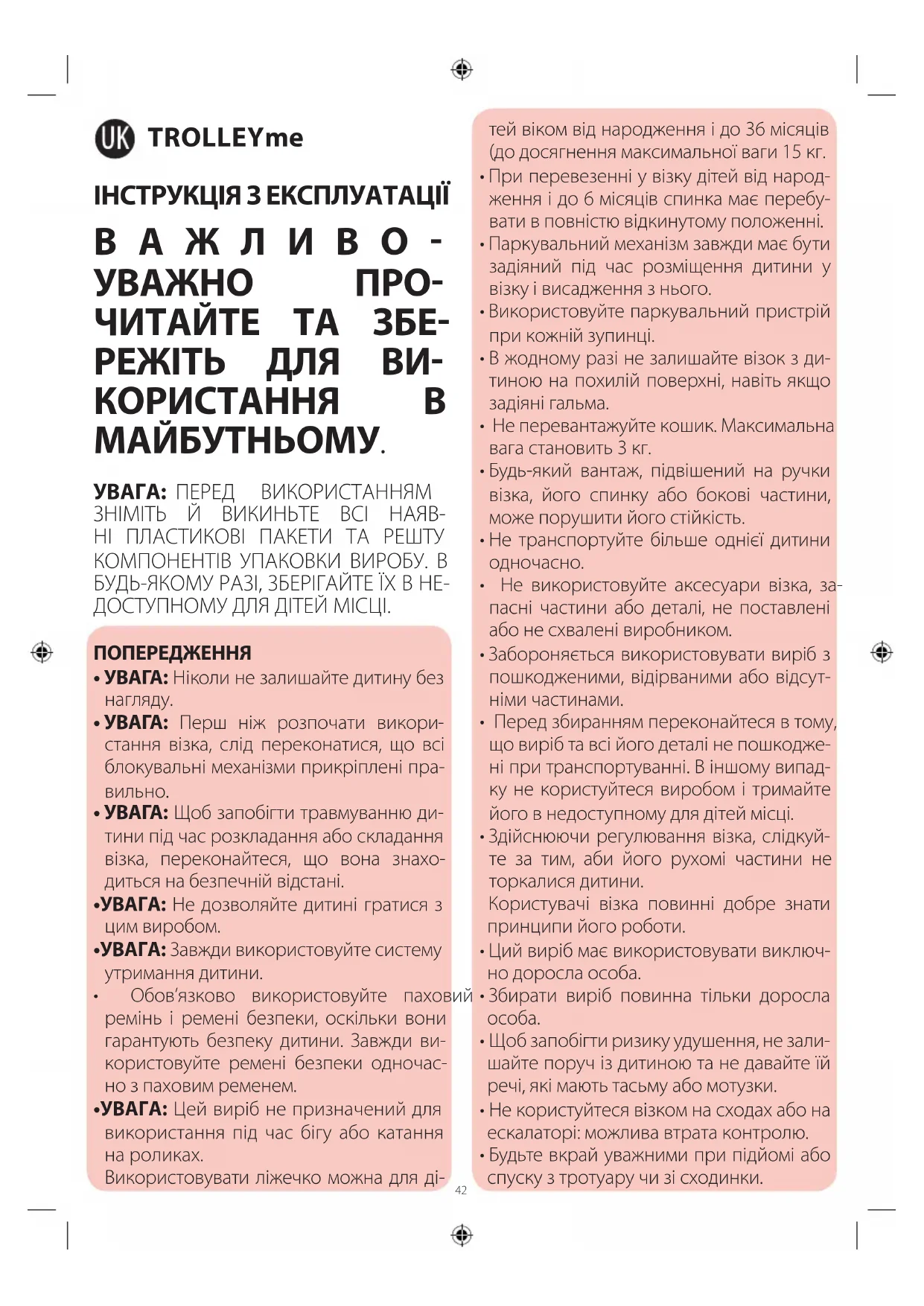 Гарантується відсутність дефектів виробу при нормальних умовах використання, передбачених у інструкції з експлу- атації. Відтак, гарантія не буде діяти в разі ушкоджень, що з'явилися внаслідок неправильної експлуатації, зношення або випадкових подій. Про строк дії гарантії відповідності можна дізнатись з відповідних положень чинного націо- нального законодавства країни, в якій придбано виріб, якщо вони передбачені.45 ИНСТРУКЦИЯ ПО ЭКС- ПЛУАТАЦИИ КОЛЯСКИ TROLLEYME (ТРОЛЛЕЙМИ) ВАЖНО - ВНИМА- ТЕЛЬНО ПРОЧИ- ТАЙТЕ ИНСТРУК- ЦИЮ И СОХРАНИТЕ ЕЕ ДЛЯ ПОСЛЕДУЮ- ЩИХ КОНСУЛЬТА-