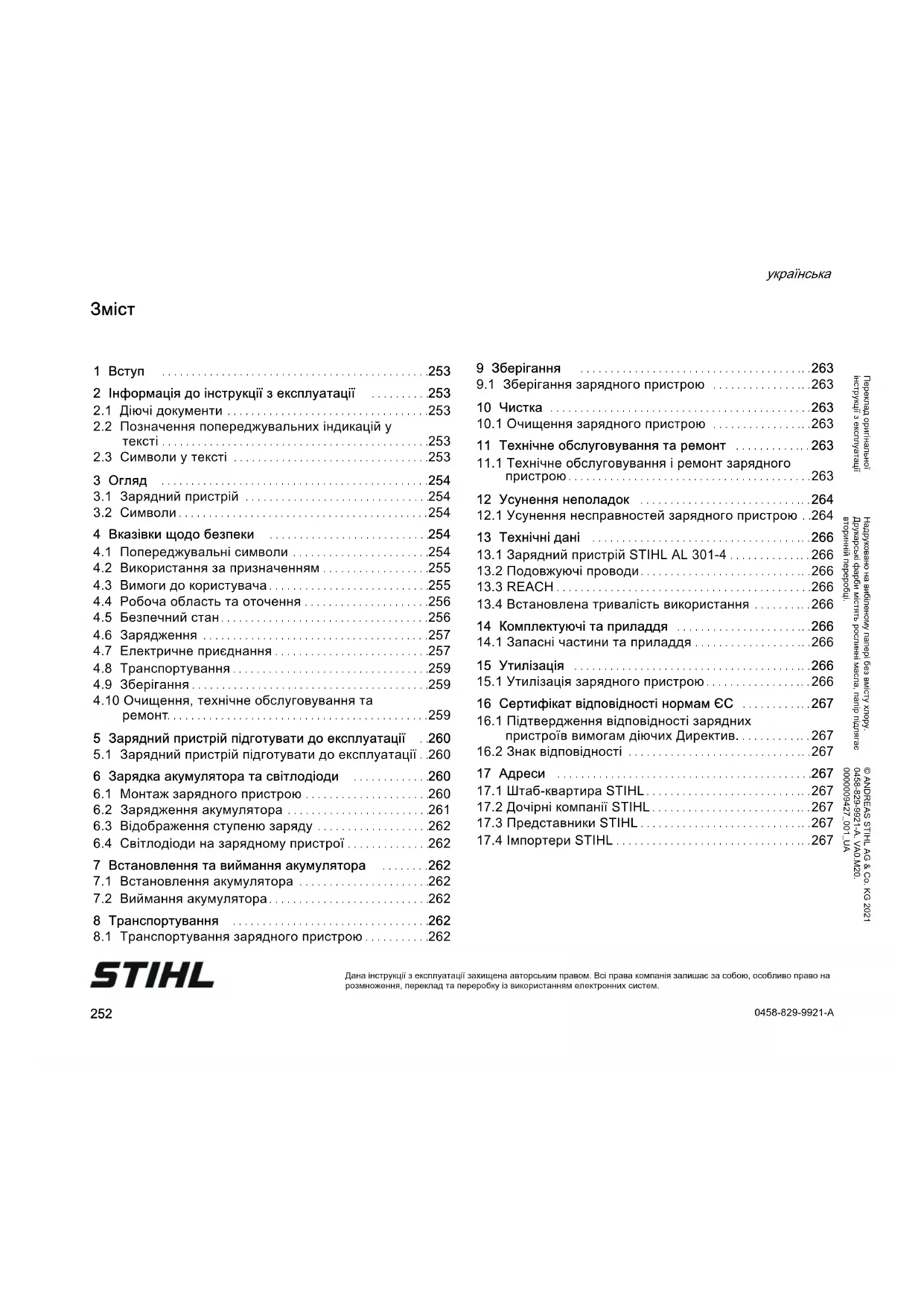пристроїв вимогам діючих Директив. Даний зарядний пристрій було виготовлено та введено у обіг із дотриманням наступних директив: 2014/35/EU, 2014/30/EU та 2011/65/EU. Рік виготовлення, країна виробника та номер агрегату вказані на зарядному пристрої. Повний текст декларації відповідності стандартам ЄС можна отримати у компанії ANDREAS STIHL AG & Co. KG, Badstraße 115, 71336 Waiblingen, Німеччина.