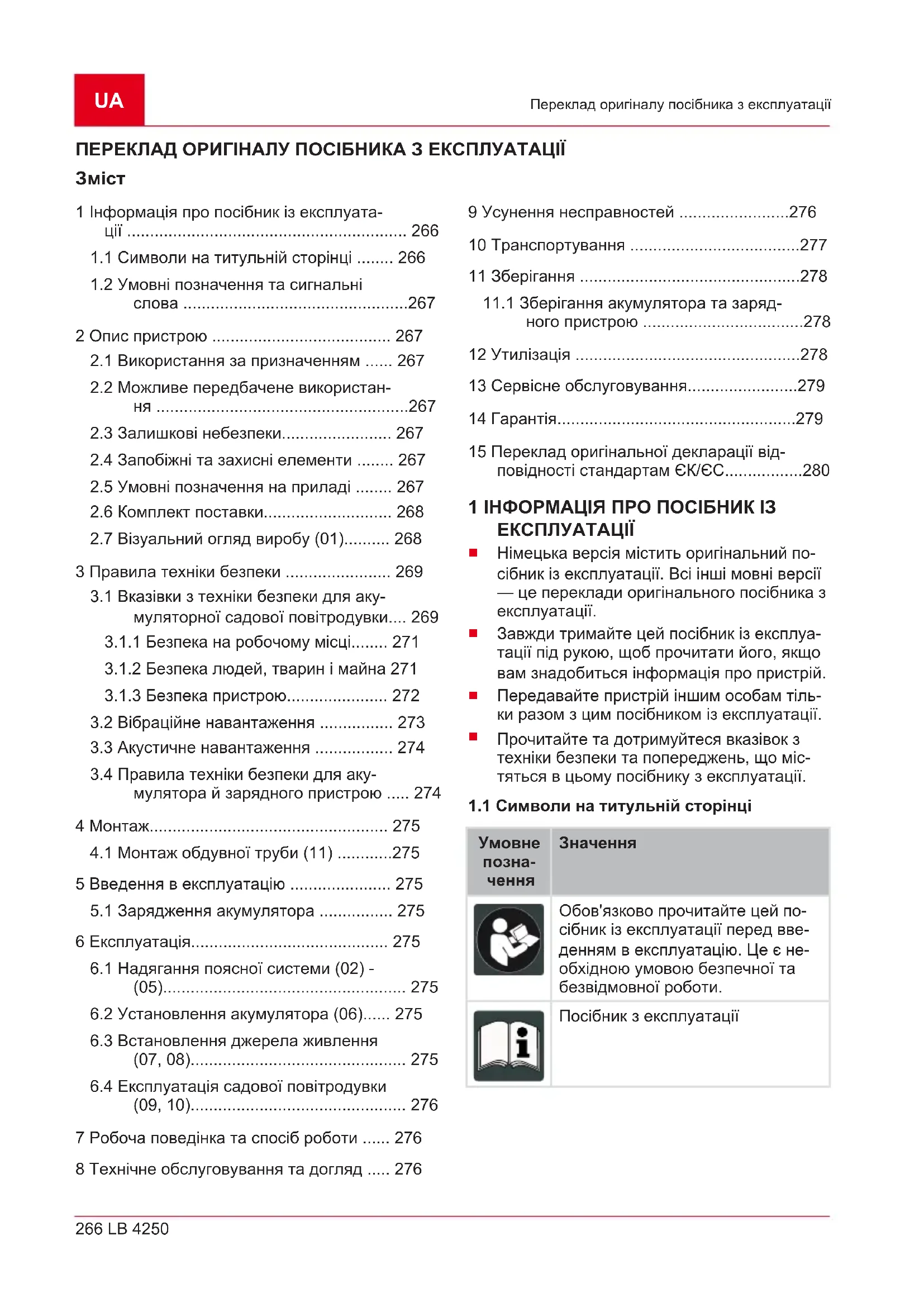 EN 60335-1:2012+A11:2014 EN 50636-2-100:2014 EN 62233:2008 EN 55014-1:2006+A1:2009 +A2 2011 EN 55014-2:2015 EN ISO 12100:2010 Kötz, 19.06.2018г. Dr. Wolfgang Hergeth Managing DirectorUA 266 LB 4250 Переклад оригіналу посібника з експлуатації ПЕРЕКЛАД ОРИГІНАЛУ ПОСІБНИКА З ЕКСПЛУАТАЦІЇ