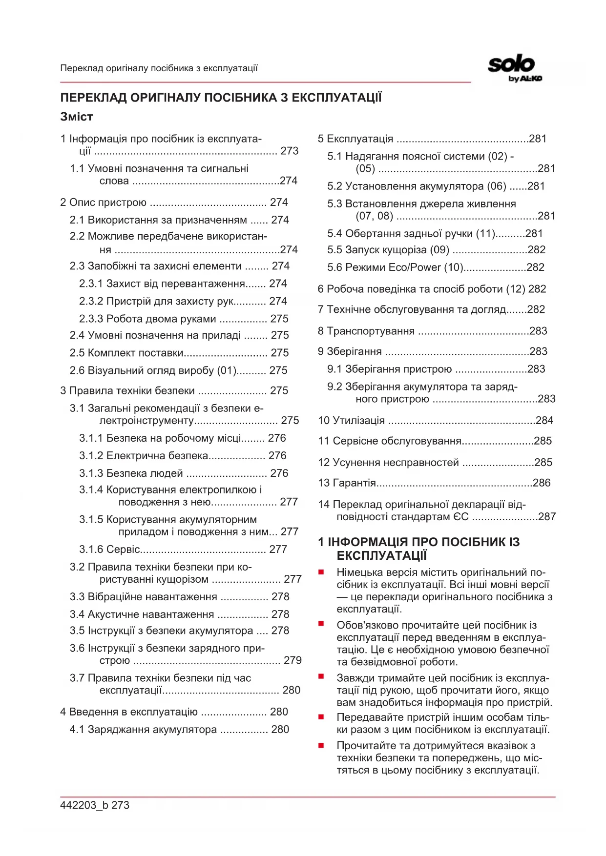 - 14 Переклад оригінальної декларації від- повідності стандартам ЄС 1 ІНФОРМАЦІЯ ПРО ПОСІБНИК ІЗ ЕКСПЛУАТАЦІЇ p. 287