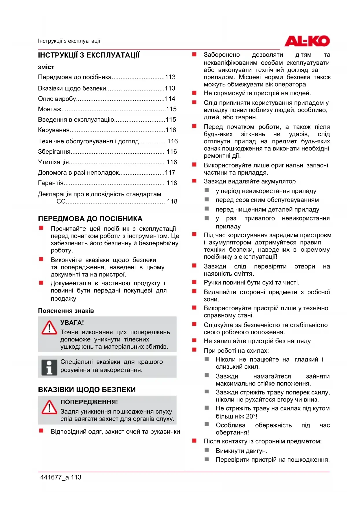 LB 36 Li AL-KO Geräte GmbH Ichenhauser Str. 14 D-89359 Kötz Andreas Hedrich Ichenhauser Str. 14 D-89359 Kötz Серійний номер Директиви ЄС Погоджені норми G253253 Рівень звуку EN ISO 3744 виміряний / гарантований 95,5 / 96 дБ(А) 2006/42/EC 2014/30/EU 2000/14/EC 2011/65/EU EN 60335-1:2012/A11:2014 EN 50636-2-100:2014 EN 55014-1 EN 55014-2 EN 62233 Уповноважений орган сертифікації Оцінка відповідності Kötz, 28.06.2016 TÜV Industrie Service GmbH TÜV Süd Gruppe Westendstraße 199 80686 MUENCHEN DEUTSCHLAND 2000/14/EC Додаток VI Wolfgang Hergeth Керівний директорEredeti használati utasítás 441677_a 119