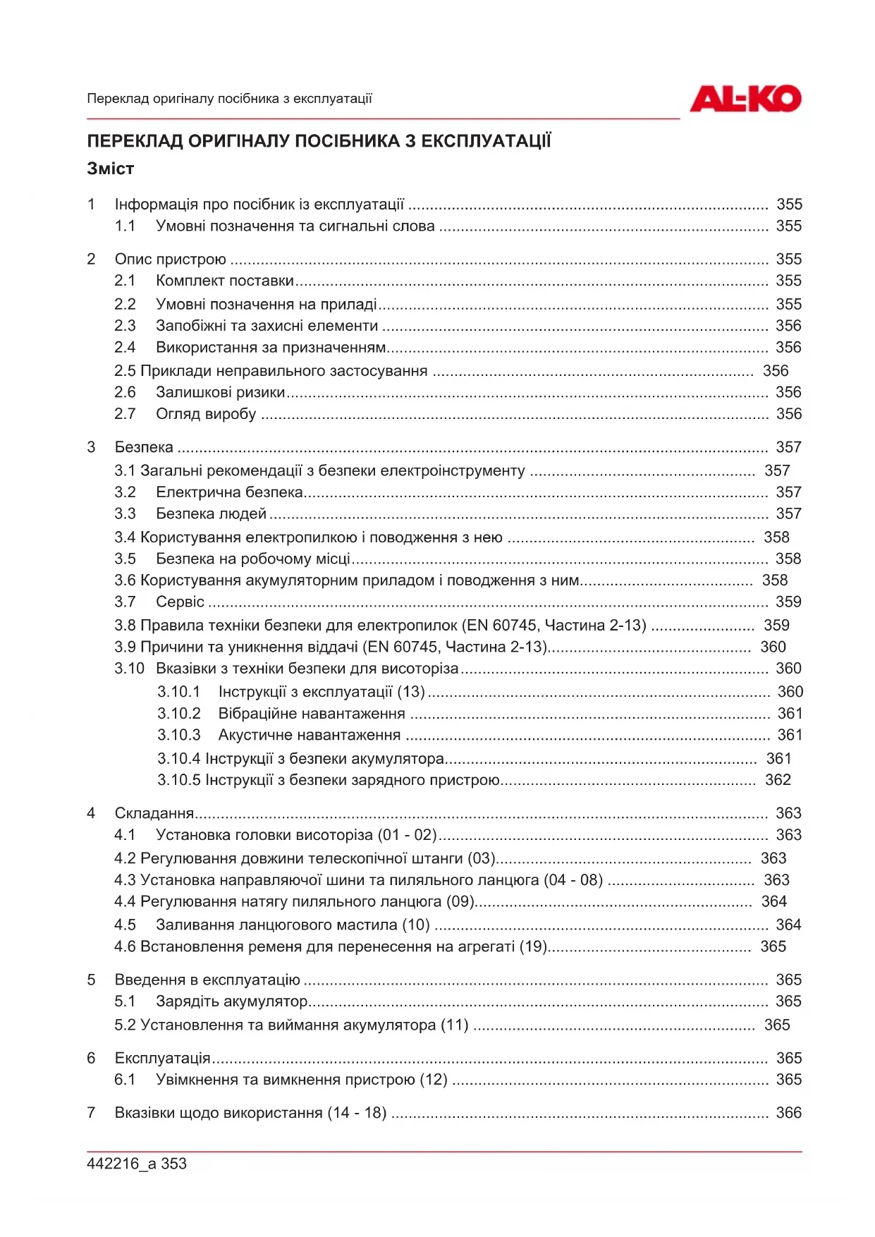EN ISO 3744 виміряний/гарантований 90,4дБ(A) / 92 дБ(A) Директиви ЄС 2006/42/ЄС 2014/30/ЄС 2000/14/ЄС 2011/65/ЄС Оцінка відповідності 2000/14/ЄС Додаток V Гармонізовані стандарти EN 60745-1:2009+A11:2010 EN 60745-2-13:2009+A1:2010 EN 55014-1:2006+A1:2009+A2:2011 EN 55014-2:2015 Kötz, 01.08.2017 Wolfgang Hergeth Керуючий директор442216_a 373 Декларація про відповідність стандартам ЄС374 CSA 2020442216_a 375AL-KO GERÄTE GmbH | Head Quarter | Ichenhauser Str. 14 | 89359 Kötz | Deutschland Telefon: (+49)8221/203-0 | Telefax: (+49)8221/203-8199 | www.al-ko.com AL-KO Service: www.al-ko.com/service-contacts
