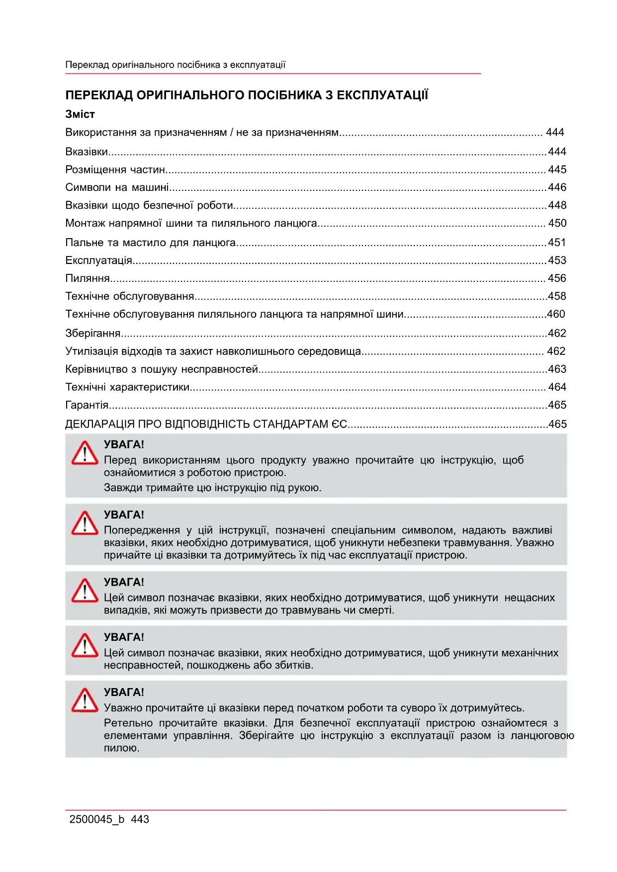 Уважно прочитайте ці вказівки перед початком роботи та суворо їх дотримуйтесь. Ретельно прочитайте вказівки. Для безпечної експлуатації пристрою ознайомтеся з елементами управління. Зберігайте цю інструкцію з експлуатації разом із ланцюговою пилою.uk Переклад оригінального посібника з експлуатації 444 2500045_b