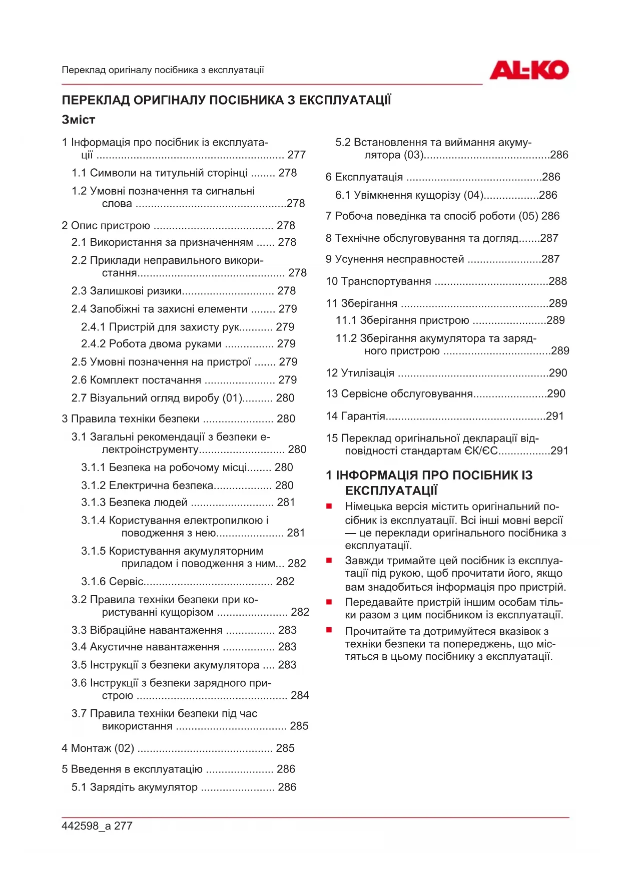 EN 60745-1 EN 60745-2-15 EN 55014-1 EN 55014-2 EN 62841-4-2:2015 EN 62233 Kötz, 14.08.2018г. Dr. Wolfgang Hergeth Managing Director442598_a 277 Переклад оригіналу посібника з експлуатації ПЕРЕКЛАД ОРИГІНАЛУ ПОСІБНИКА З ЕКСПЛУАТАЦІЇ