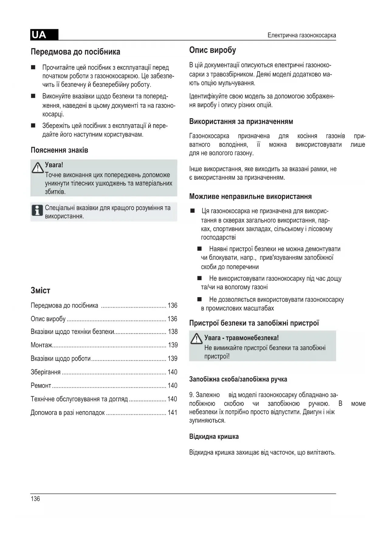 - Допомогавразінеполадок Опис виробу Вційдокументаціїописуютьсяелектричнігазоноко- саркизтравозбірником.Деякімоделідодатковома- ютьопціюмульчування. Ідентифікуйтесвоюмодельзадопомогоюзображен- нявиробуіописурізнихопцій. Використання за призначенням Газонокосарка призначена для косіння газонів при- ватного володіння, її можна використовувати лише дляневологогогазону. Іншевикористання,якевиходитьзавказанірамки,не євикористаннямзапризначенням. Можливе неправильне використання Цягазонокосарканепризначенадлявикорис- таннявскверахзагальноговикористання,пар- ках,спортивнихзакладах,сільськомуілісовому господарстві Наявніпристроїбезпекинеможнадемонтувати чиблокувати,напр.,прив'язуваннямзапобіжної скобидопоперечини Невикористовуватигазонокосаркупідчасдощу та/чинавологомугазоні Недозволяєтьсявикористовуватигазонокосарку впромисловихмасштабах Пристрої безпеки та запобіжні пристрої Увага - травмонебезпека! Невимикайтепристроїбезпекитазапобіжні p. 141