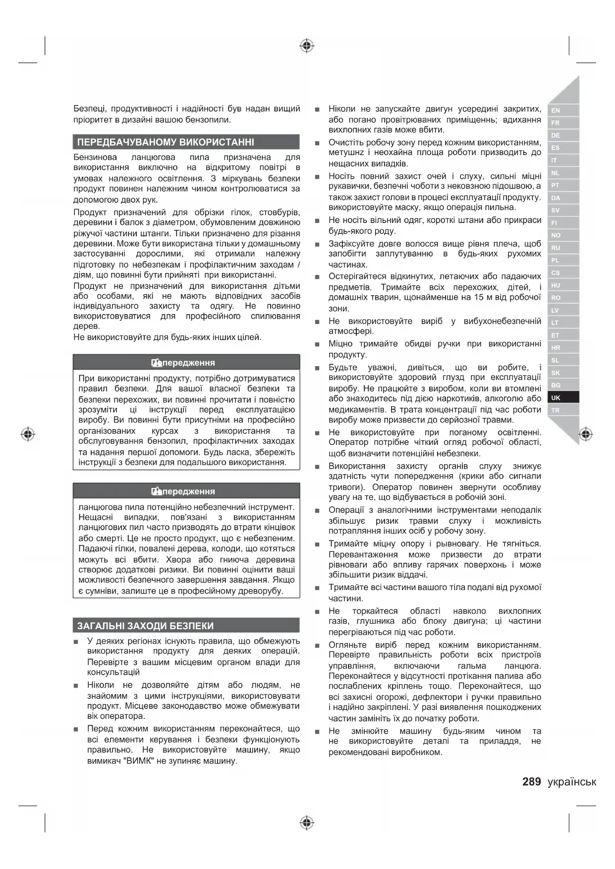Попередження При використанні продукту, потрібно дотримуватися правил безпеки. Для вашої власної безпеки та безпеки перехожих, ви повинні прочитати і повністю зрозуміти ці інструкції перед експлуатацією виробу. Ви повинні бути присутніми на професійно організованих курсах з використання та обслуговування бензопил, профілактичних заходах та надання першої допомоги. Будь ласка, збережіть інструкції з безпеки для подальшого використання. Попередження ланцюгова пила потенційно небезпечний інструмент. Нещасні випадки, пов'язані з використанням ланцюгових пил часто призводять до втрати кінцівок або смерті. Це не просто продукт, що є небезпеним. Падаючі гілки, повалені дерева, колоди, що котяться можуть всі вбити. Хвора або гниюча деревина створює додаткові ризики. Ви повинні оцінити ваші можливості безпечного завершення завдання. Якщо є сумніви, залиште це в професійному древорубу. ЗАГАЛЬНІ ЗАХОДИ БЕЗПЕКИ ■ У деяких регіонах існують правила, що обмежують використання продукту для деяких операцій. Перевірте з вашим місцевим органом влади для консультацій ■ Ніколи не дозволяйте дітям або людям, не знайомим з цими інструкціями, використовувати продукт. Місцеве законодавство може обмежувати вік оператора. ■ Перед кожним використанням переконайтеся, що всі елементи керування і безпеки функціонують правильно. Не використовуйте машину, якщо вимикач "ВИМК" не зупиняє машину. ■ Ніколи не запускайте двигун усередині закритих, або погано провітрюваних приміщеннь; вдихання вихлопних газів може вбити. ■ Очистіть робочу зону перед кожним використанням, метушнz і неохайна площа роботи призводить до нещасних випадків. ■ Носіть повний захист очей і слуху, сильні міцні рукавички, безпечні чоботи з нековзною підошвою, а також захист голови в процесі експлуатації продукту. використовуйте маску, якщо операція пильна. ■ Не носіть вільний одяг, короткі штани або прикраси будь-якого роду. ■ Зафіксуйте довге волосся вище рівня плеча, щоб запобігти заплутуванню в будь-яких рухомих
