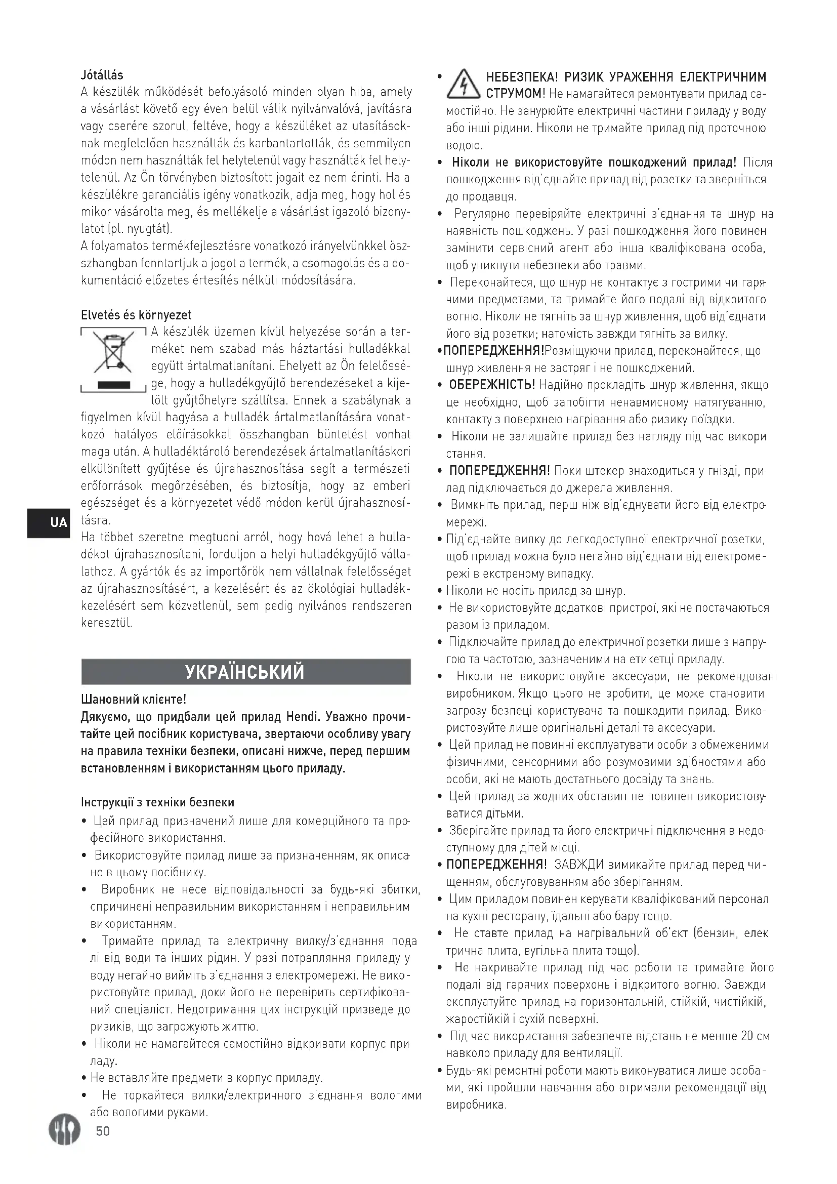 кинути відходи для переробки, зверніться до місцевої компа- нії з збору відходів. Виробники та імпортери не несуть відпо- відальності за переробку, лікування та екологічну утилізацію, як безпосередньо, так і через загальнодоступну систему. EESTI KEEL Lugupeetud klient! Täname, et ostsite selle Hendi seadme. Lugege käesolev ka