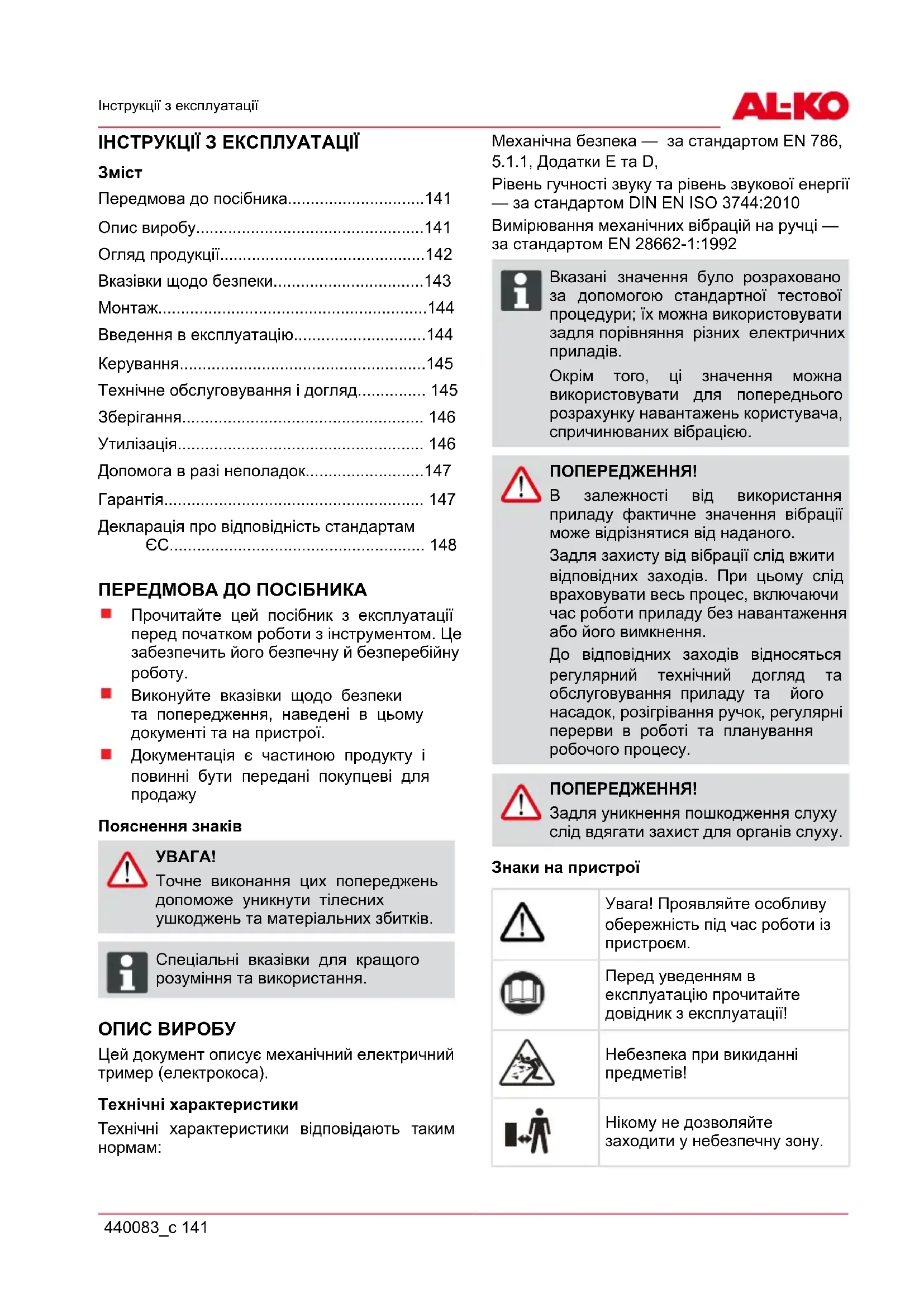 Точне виконання цих попереджень допоможе уникнути тілесних ушкоджень та матеріальних збитків. ADVICE Спеціальні вказівки для кращого розуміння та використання. ОПИС ВИРОБУ Цей документ описує механічний електричний тример (електрокоса). Технічні характеристики Технічні характеристики відповідають таким