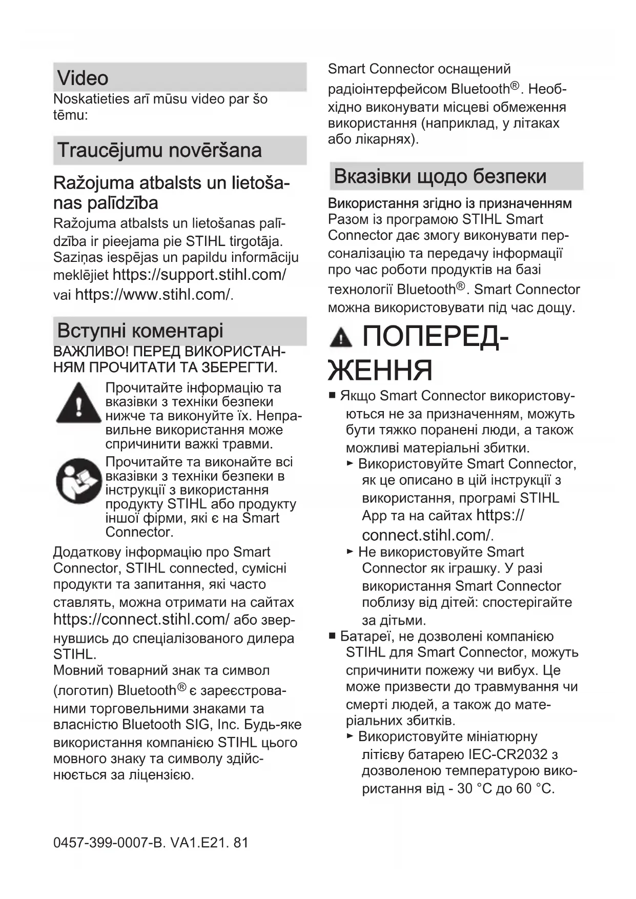 0457-399-0007-B. VA1.E21.Video Noskatieties arī mūsu video par šo tēmu: Traucējumu novēršana Ražojuma atbalsts un lietoša‐ nas palīdzība Ražojuma atbalsts un lietošanas palī‐ dzība ir pieejama pie STIHL tirgotāja. Saziņas iespējas un papildu informāciju meklējiet https://support.stihl.com/ vai https://www.stihl.com/. Вступні коментарі ВАЖЛИВО! ПЕРЕД ВИКОРИСТАН‐ НЯМ ПРОЧИТАТИ ТА ЗБЕРЕГТИ. Прочитайте інформацію та вказівки з техніки безпеки нижче та виконуйте їх. Непра‐ вильне використання може спричинити важкі травми. Прочитайте та виконайте всі вказівки з техніки безпеки в інструкції з використання продукту STIHL або продукту іншої фірми, які є на Smart Connector. Додаткову інформацію про Smart Connector, STIHL connected, сумісні продукти та запитання, які часто ставлять, можна отримати на сайтах https://connect.stihl.com/ або звер‐ нувшись до спеціалізованого дилера STIHL. Мовний товарний знак та символ (логотип) Bluetooth