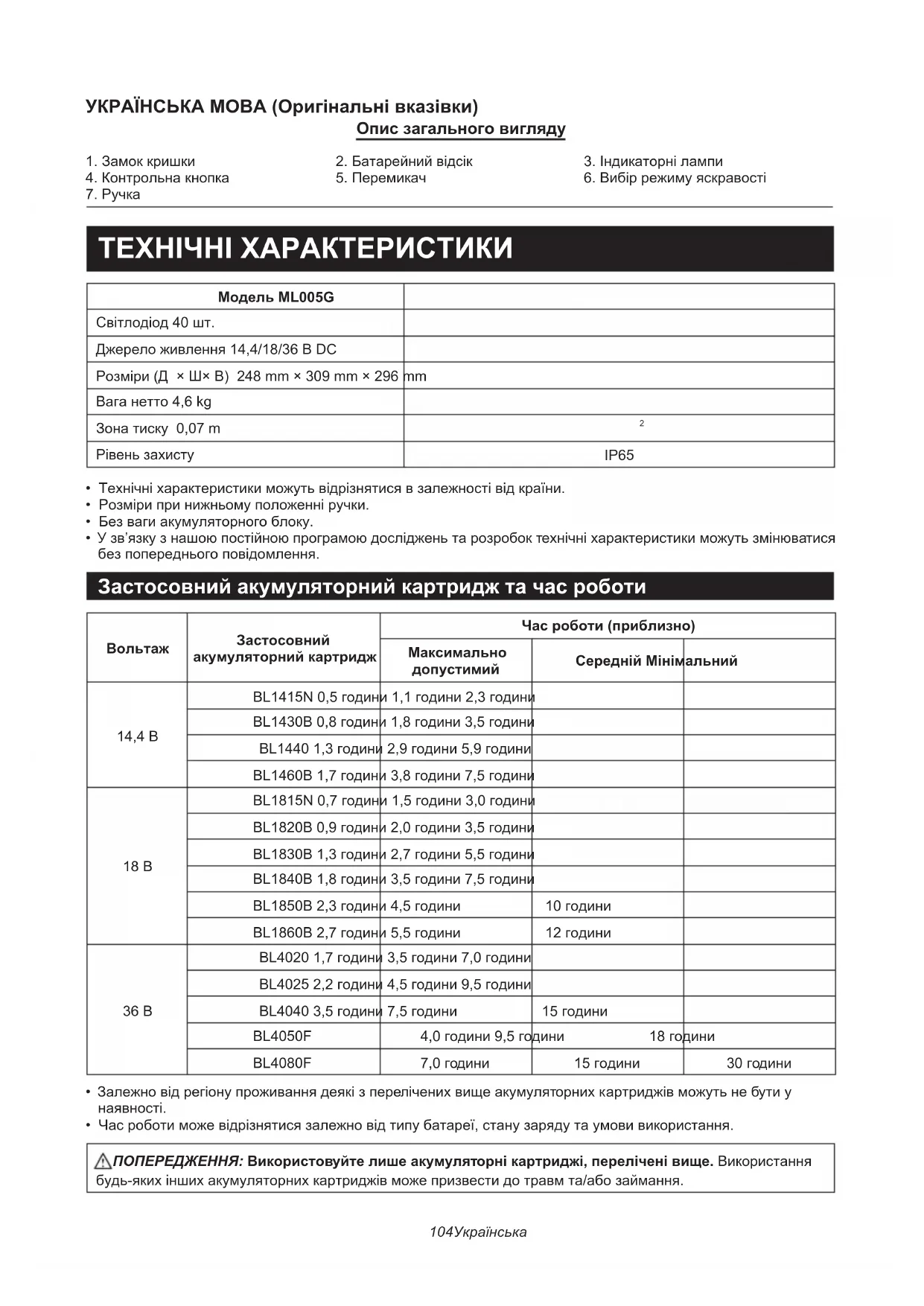 - Час роботи може відрізнятися залежно від типу батареї, стану заряду та умови використання. ПОПЕРЕДЖЕННЯ: Використовуйте лише акумуляторні картриджі, перелічені вище. Використання будь-яких інших акумуляторних картриджів може призвести до травм та/або займання.105 Українська