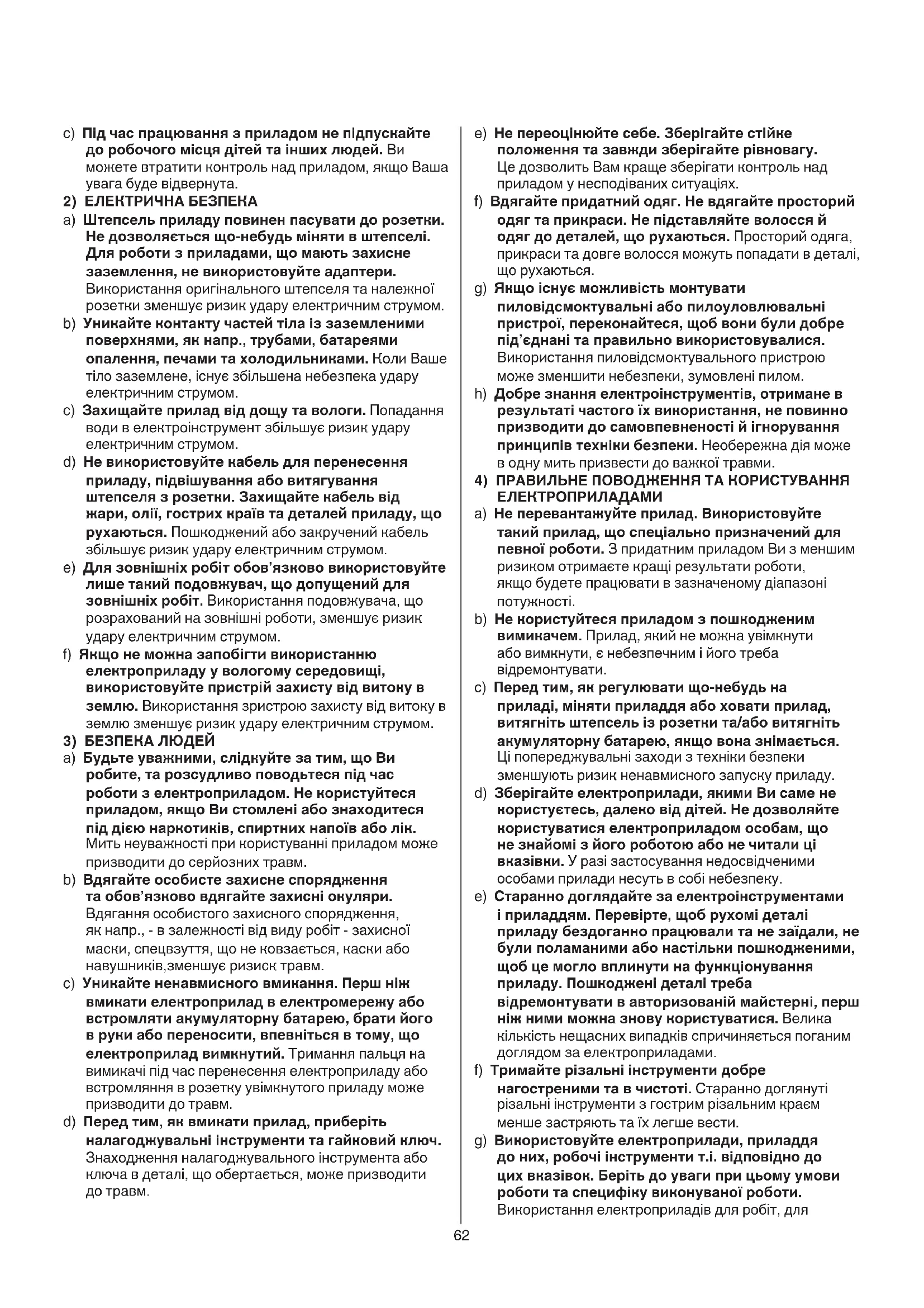ЗАГАЛЬНІ ВКАЗІВКИ З ТЕХНІКИ БЕЗПЕКИ ПОВОДЖЕННЯ З ЕЛЕКТРОІНСТРУМЕНТАМИ - ПОПЕРЕДЖЕННЯ Уважно вивчіть запобіжні заходи та ілюстрації, а також прочитайте вказівки та технічні умови, що входять в комплект поставки цього електроінструменту. Недотримання нижчеперелічених вказівок у повному обсязі може спричинити ураження електричним струмом, пожежу та / або серйозну травму. Добре зберігайте на майбутнє ці попередження і