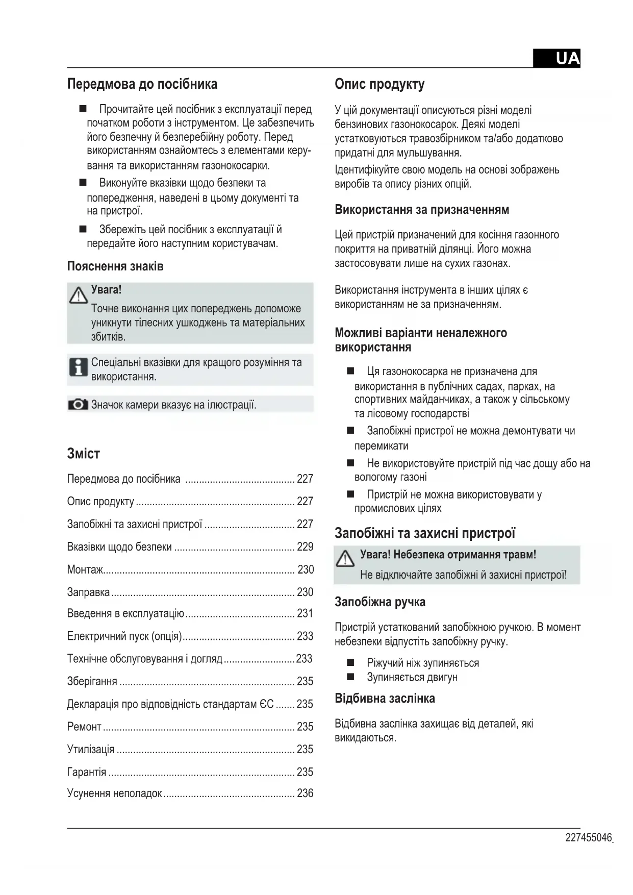 Використовуйтепристрійлишеутехнічно бездоганномустані! Увага! Небезпека отримання травм! Невідключайтезапобіжнійзахисніпристрої! Увага - небезпека пожежі! Незберігайтезаправленумашинувбудівлях, вякихіснуєнебезпекаконтактупарівбензину звідкритимполум’ямабоіскрами! Утримуйтевчистотіобластьнавколодвигуна, вихлипноїтруби,блокаакумуляторноїбатареї тапаливногобаку:тутнеповиннобутитрави, бензинутамасла. Недопускайтетретіхосібунебезпечнузону Операторабокористувачнесевідповідальність занещаснівипадкизіншимиособамитаїх