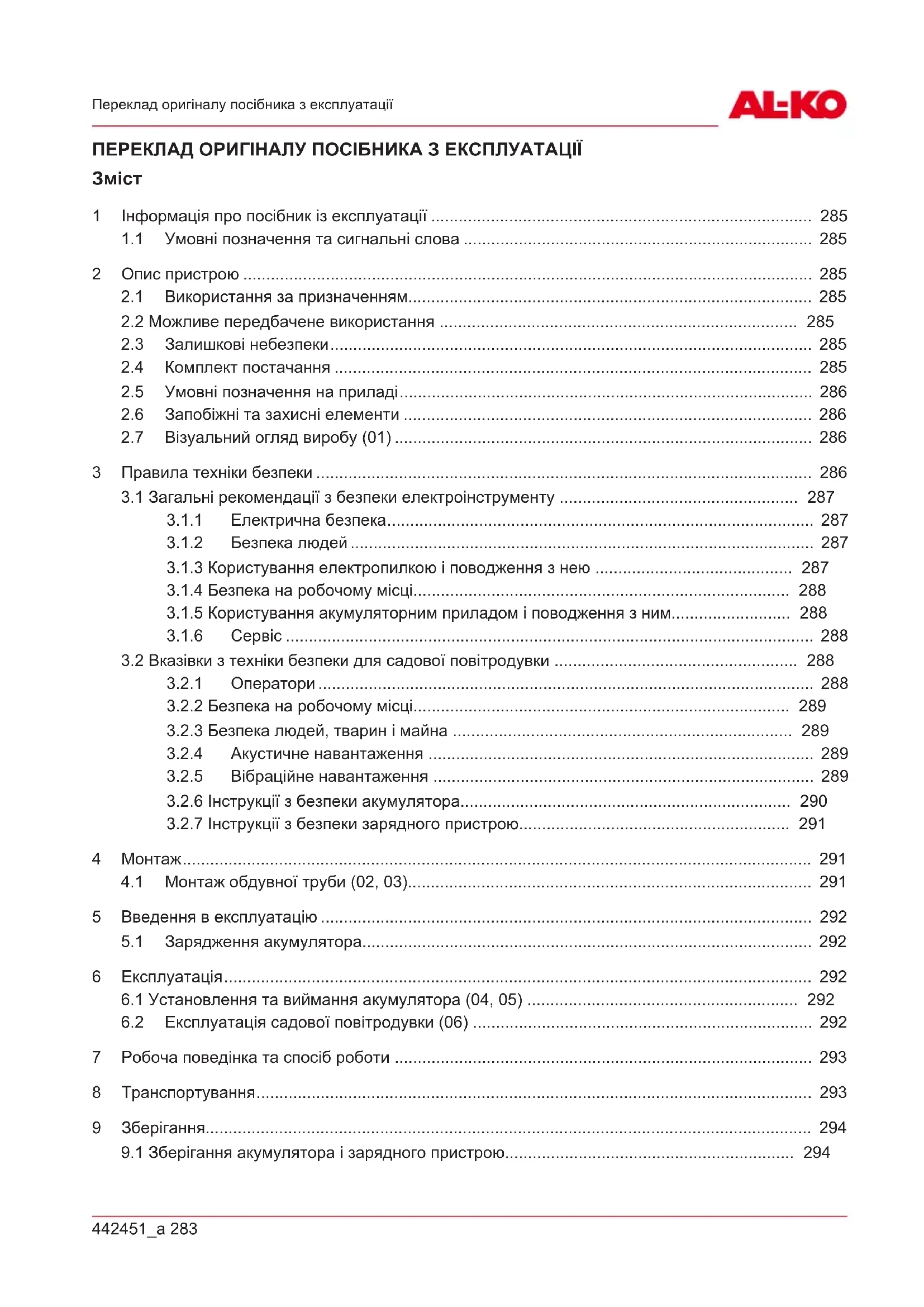 3.2 Вказівки з техніки безпеки для садової повітродувки ..................................................... 288