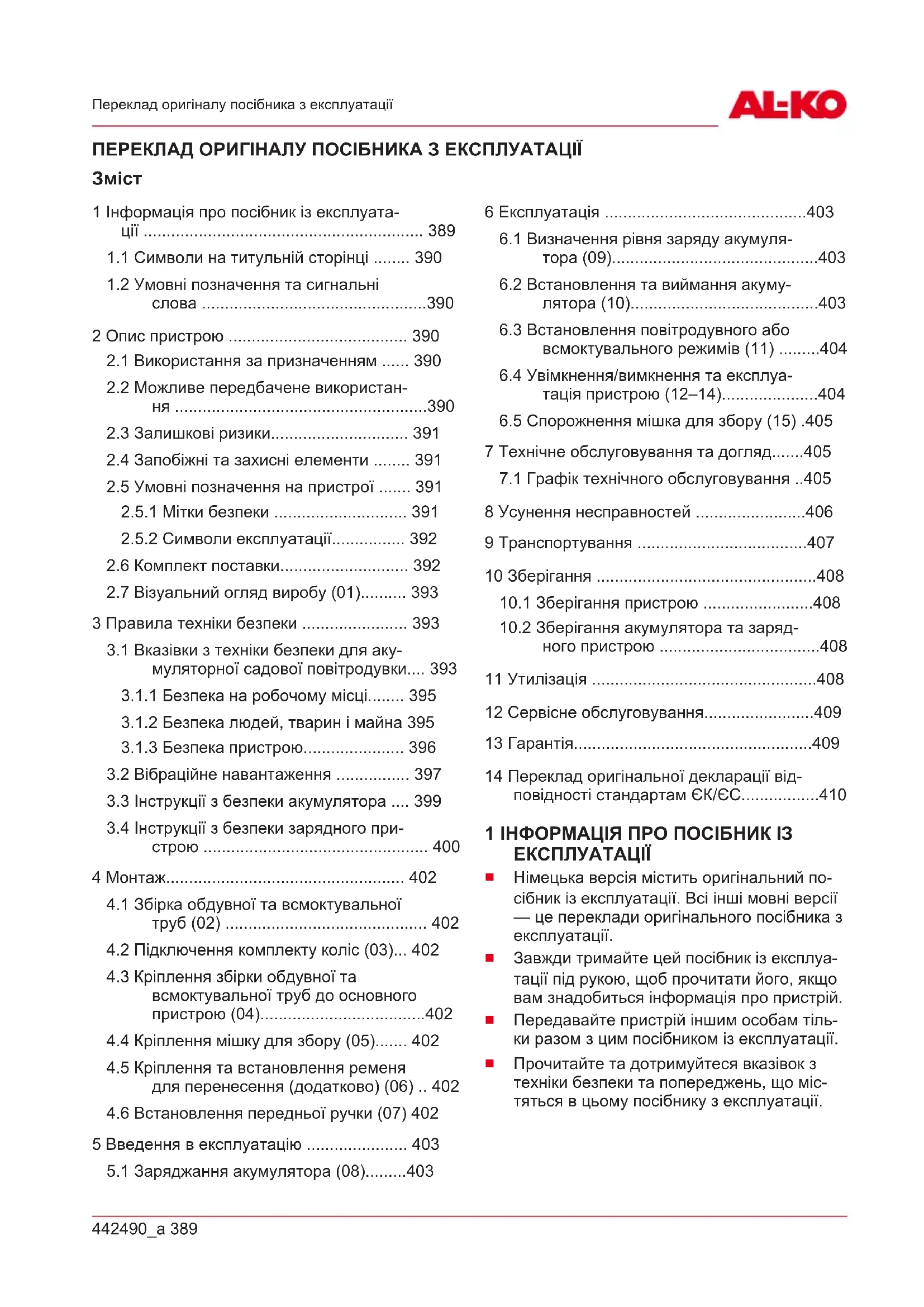 EN ISO 3744 виміряний/гарантований 99,5дБ(A) / 102 дБ(A) Директиви ЄС 2006/42/ЄС 2014/30/ЄС 2000/14/ЄС 2011/65/ЄС Оцінка відповідності 2000/14/ЄС Додаток V Гармонізовані стандарти EN 60335-1:2012 EN 50636-2-100:2014 EN 62233:2008 EN ISO 12100:2010 EN 55014-1:2006+A1:2009+A2:2011 EN 55014-2:2015 EN61000-3-2:2014 EN61000-3-3:2013 Kötz, 20.03.2018 Dr. Wolfgang Hergeth Managing Director442490_a 411 Переклад оригінальної декларації відповідності стандартам ЄК/ЄСAL-KO GERÄTE GmbH | Head Quarter | Ichenhauser Str. 14 | 89359 Kötz | Deutschland Telefon: (+49)8221/203-0 | Telefax: (+49)8221/203-8199 | www.al-ko.com AL-KO Service: www.al-ko.com/service-contacts